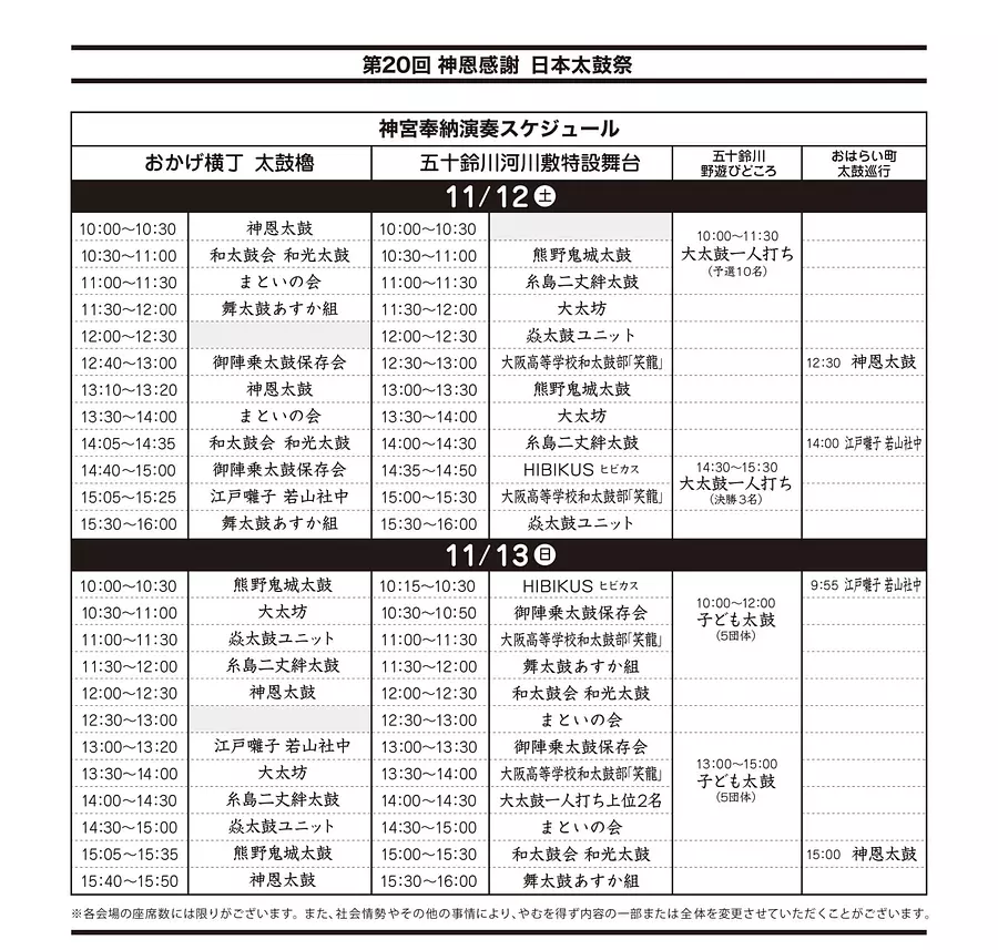 会場:おかげ横丁太鼓櫓・五十鈴川河川敷特設舞台・おはらい町通り・五十鈴川野遊びどころ