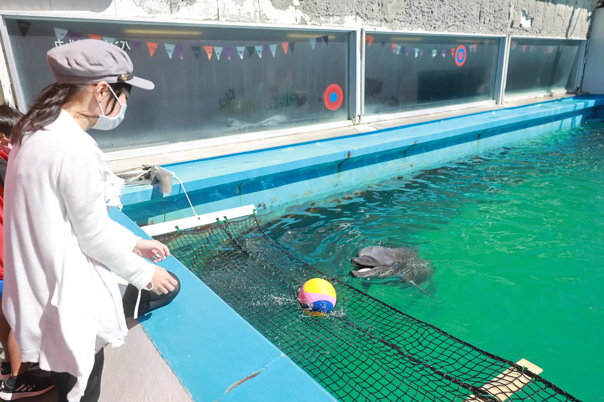 海獣広場のイルカプールで飼育され、手で触れるくらいの距離感で鑑賞できます。