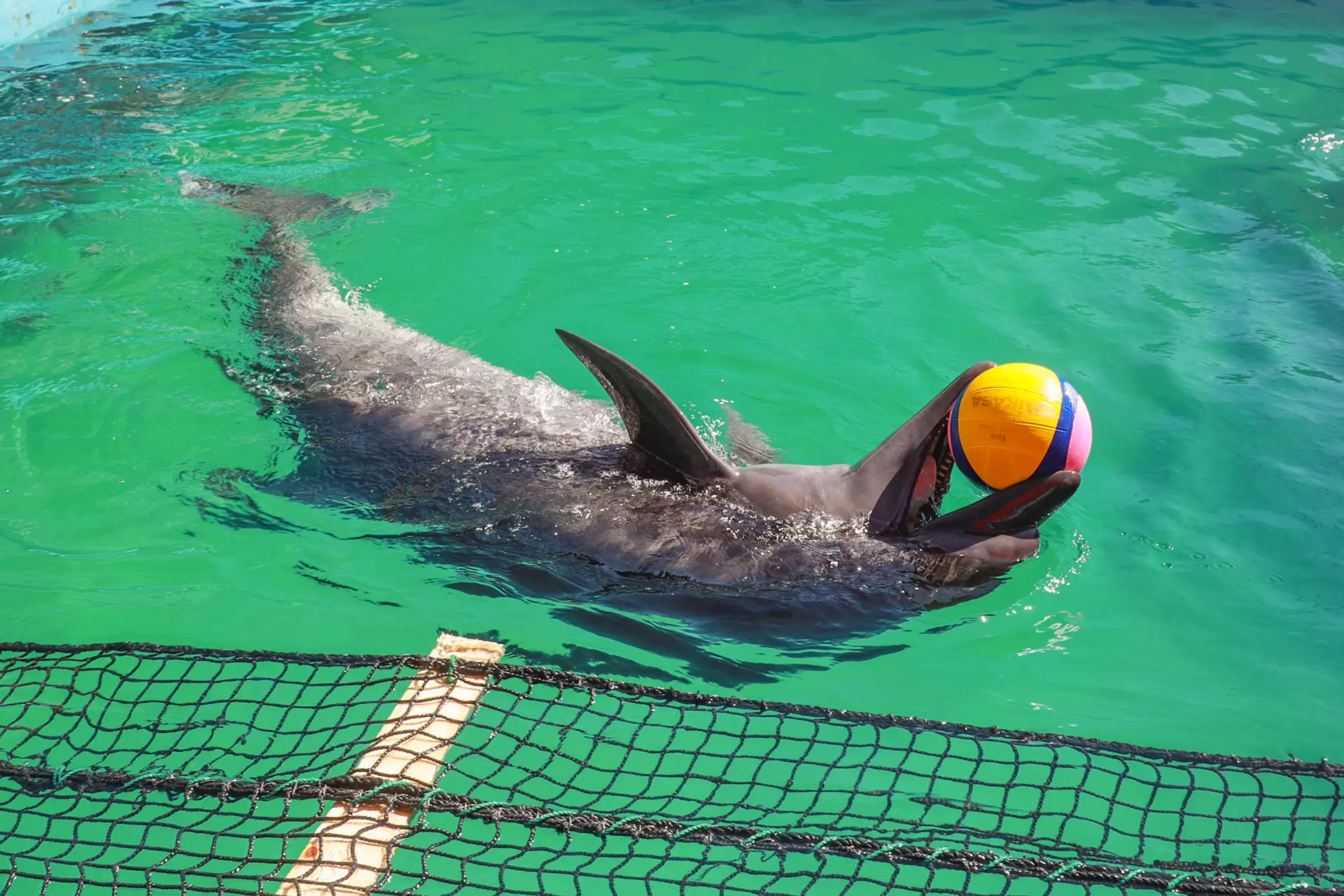 イルカの気分次第ですが、プールに浮かぶネットにボールを置いてくれたらキャッチボールを楽しめるチャンス!