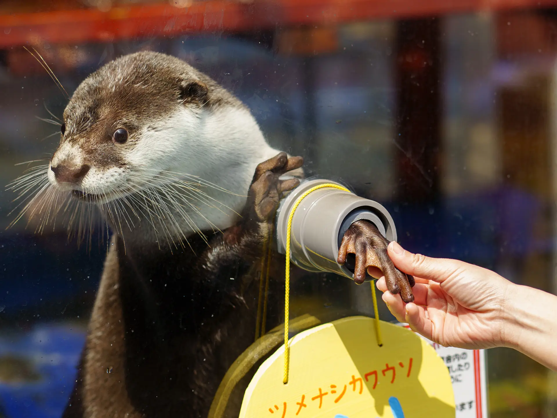 ふがまる 水槽から飛び出ている筒越しにカワウソと握手できますよ