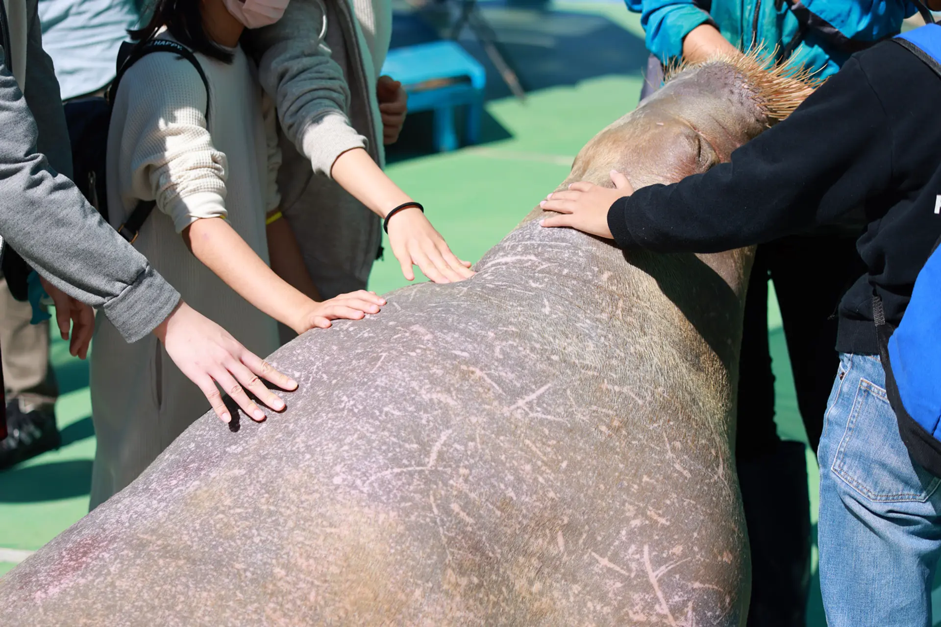 このイベントは柵なしで実施されるので、セイウチに急接近できるのはもちろん、イベント終盤ではセイウチに直接触れることも♪