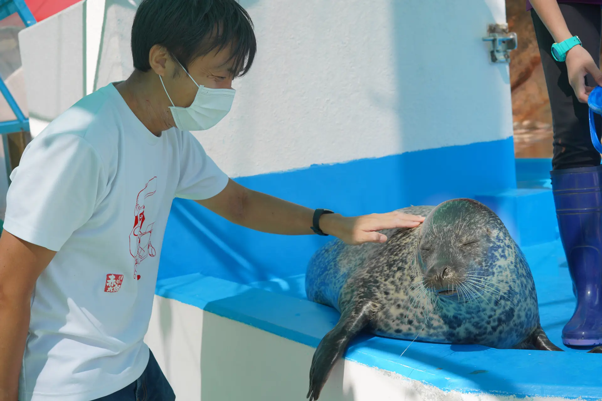 海獣広場でゴマフアザラシとふれあえるイベントが「ゴマちゃんタッチ」。柵越しではなく、目の前にいるアザラシを手でタッチできます。