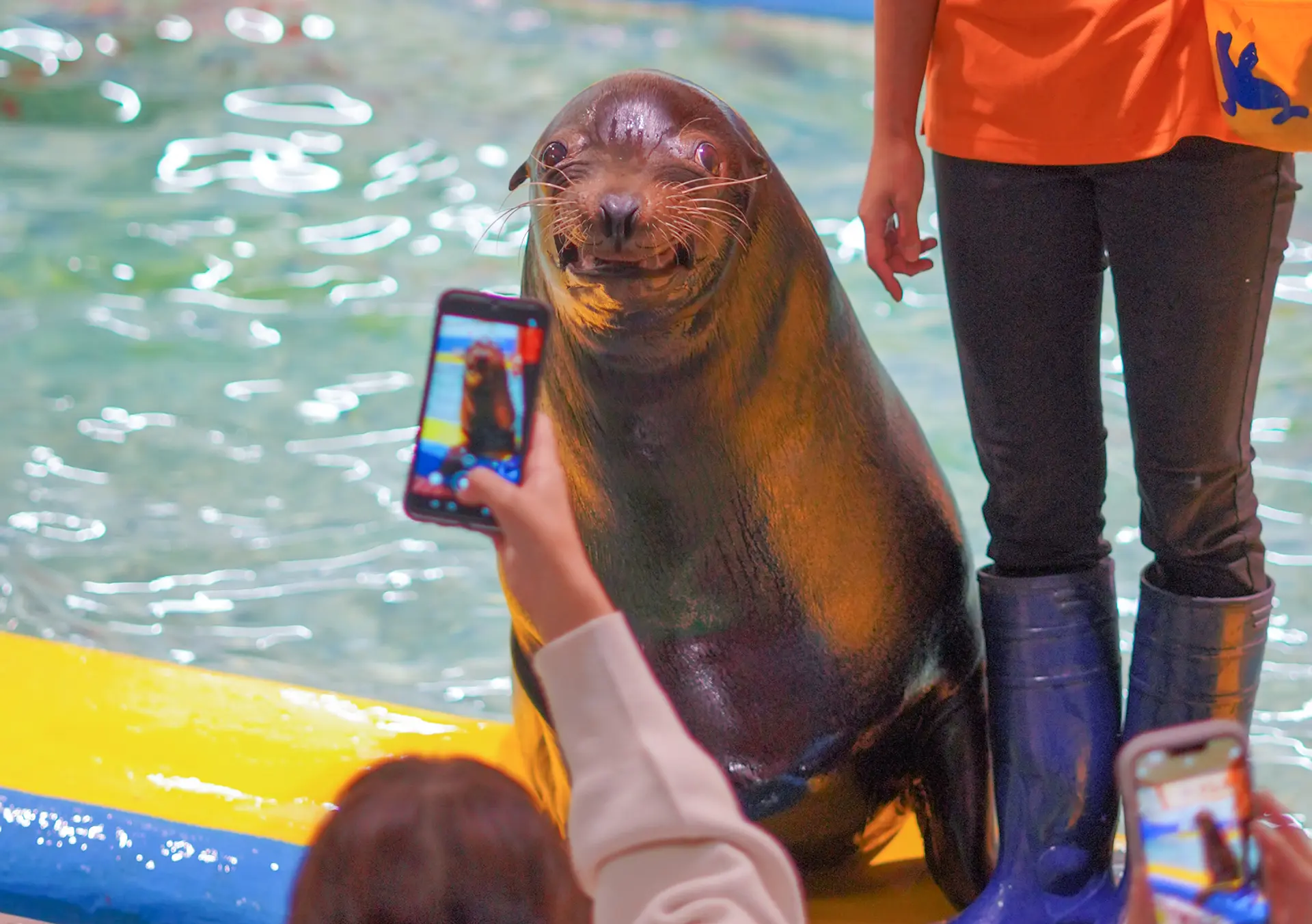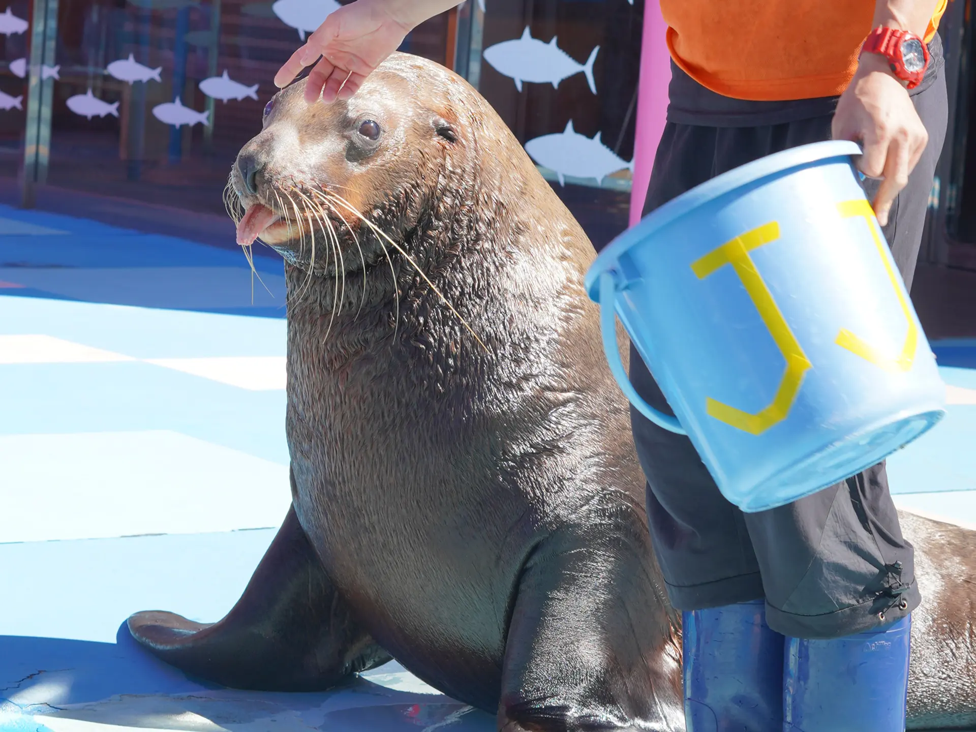 トドファミリーが水槽から出てくるイベント「トドのお食事タイム」では、お食事する様子や可憐なパフォーマンスを観客席の前で披露します。
