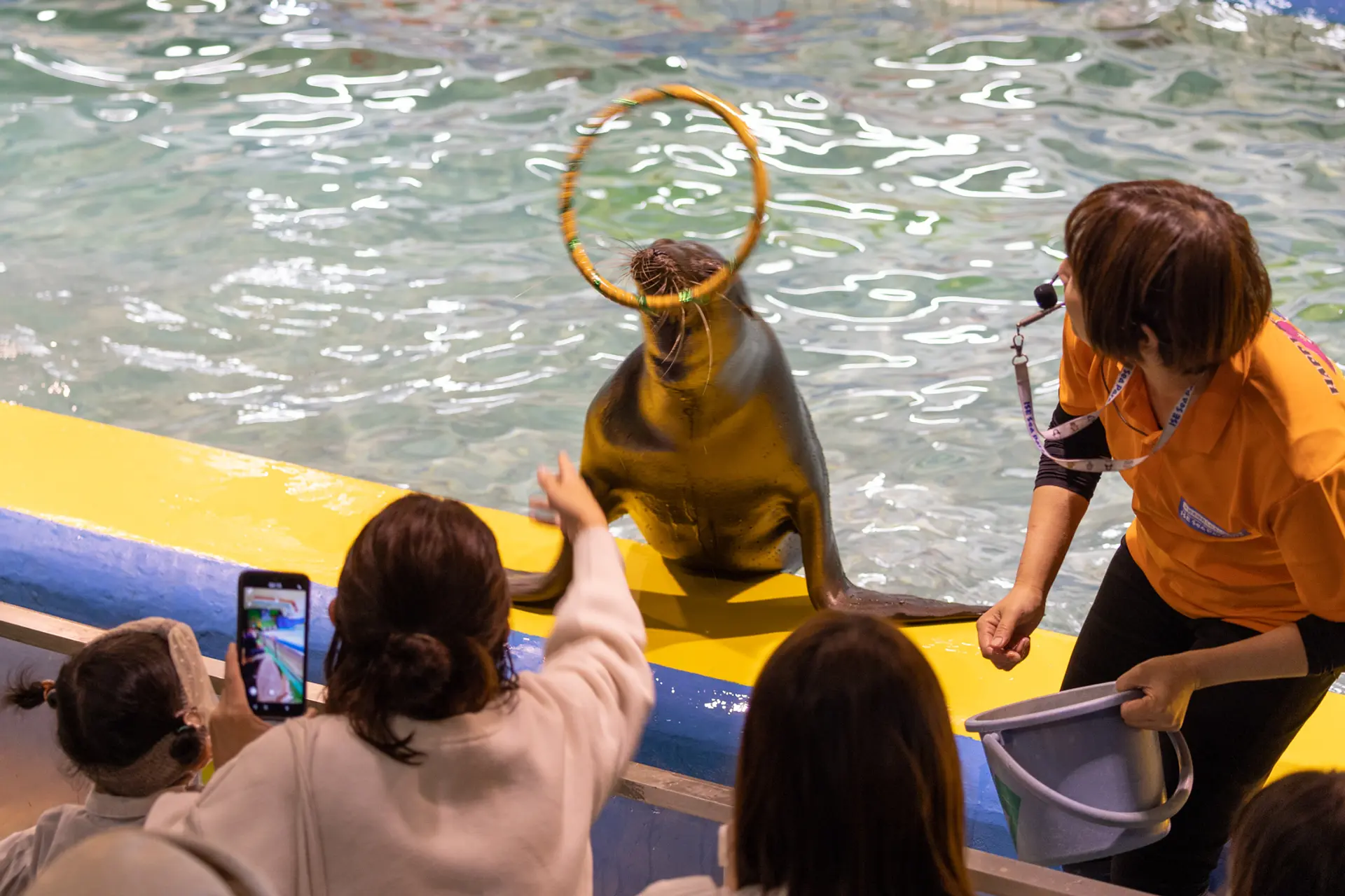 客席の最前列に座ると、アシカと触れ合えるチャンスも!目の前にいるアシカと輪投げを楽しめますよ♪