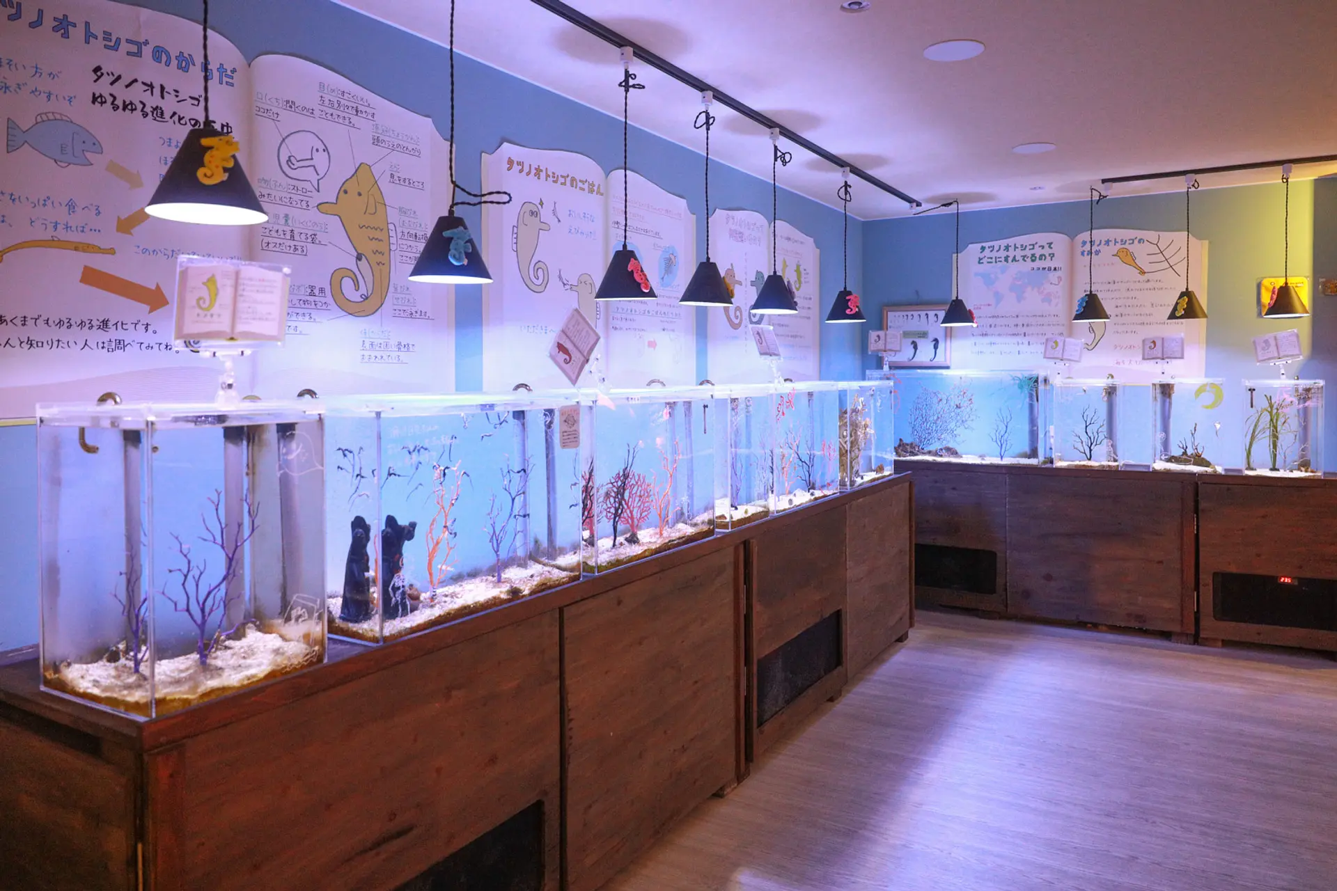 タツノオトシゴの飼育種類数は日本一を誇り、1種類ずつ展示する水槽や、複数種類が見られる大型水槽など、タツノオトシゴをとことん鑑賞できるエリアです。