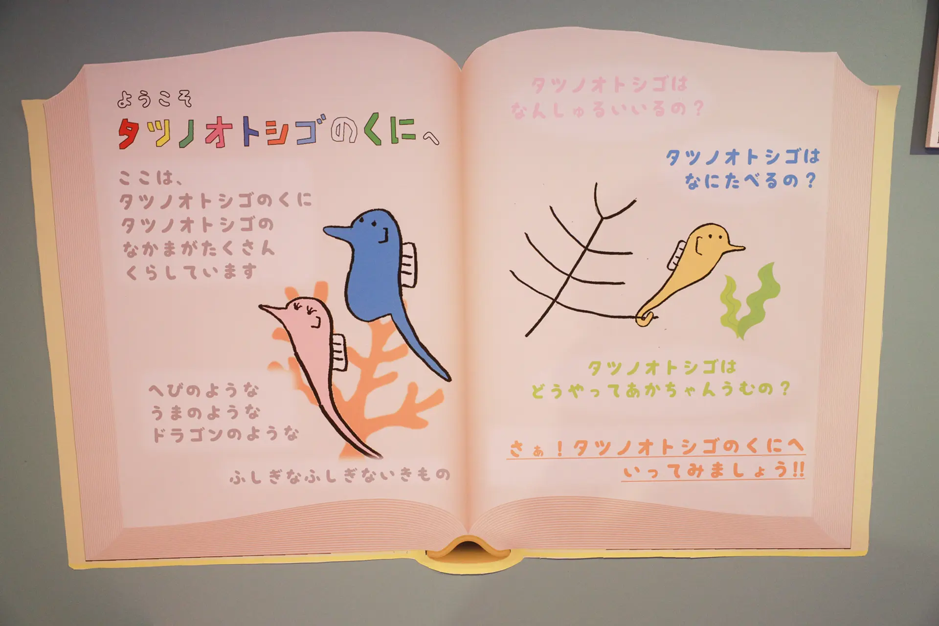 「タツノオトシゴのくに」の見所は種類の多さだけでなく、可愛いイラスト展示も必見です。