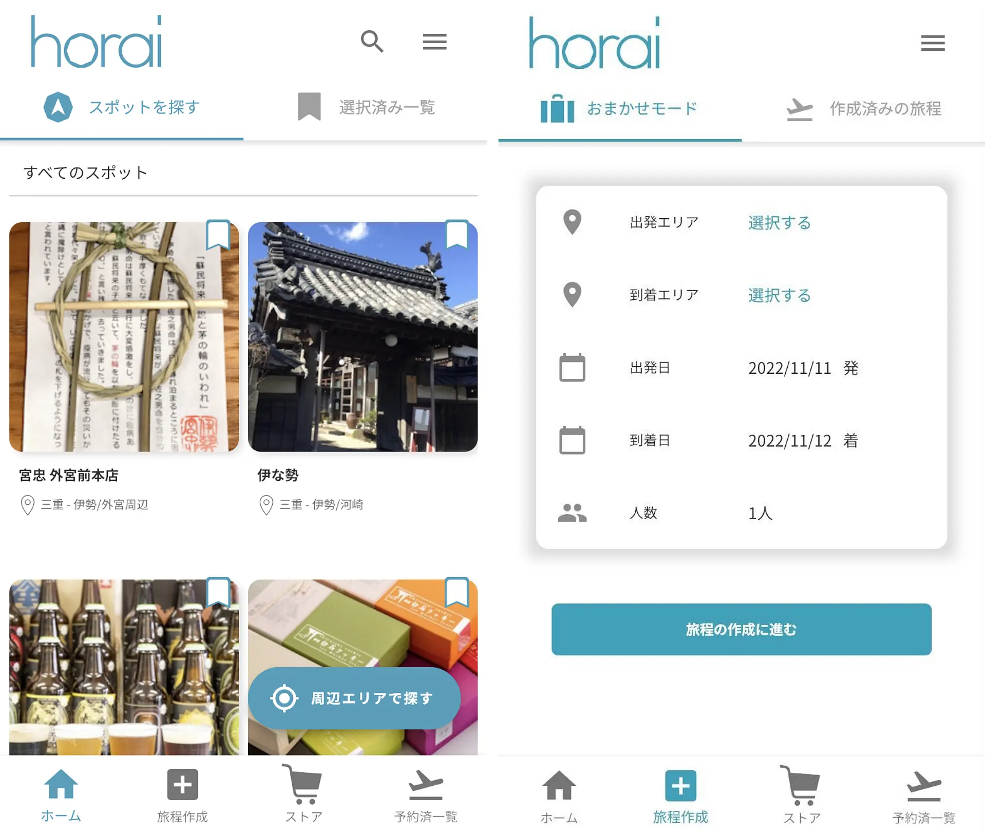 伊勢神宮や飲食店をはじめとした観光スポット400近くの豊富なスポット情報がHoraiアプリに登録されています。Horaiアプリを使えば旅行で行きたいスポットを見つけるのに便利です。気になるスポットを保存して、自動で旅程作成ができる便利な機能も付いています。