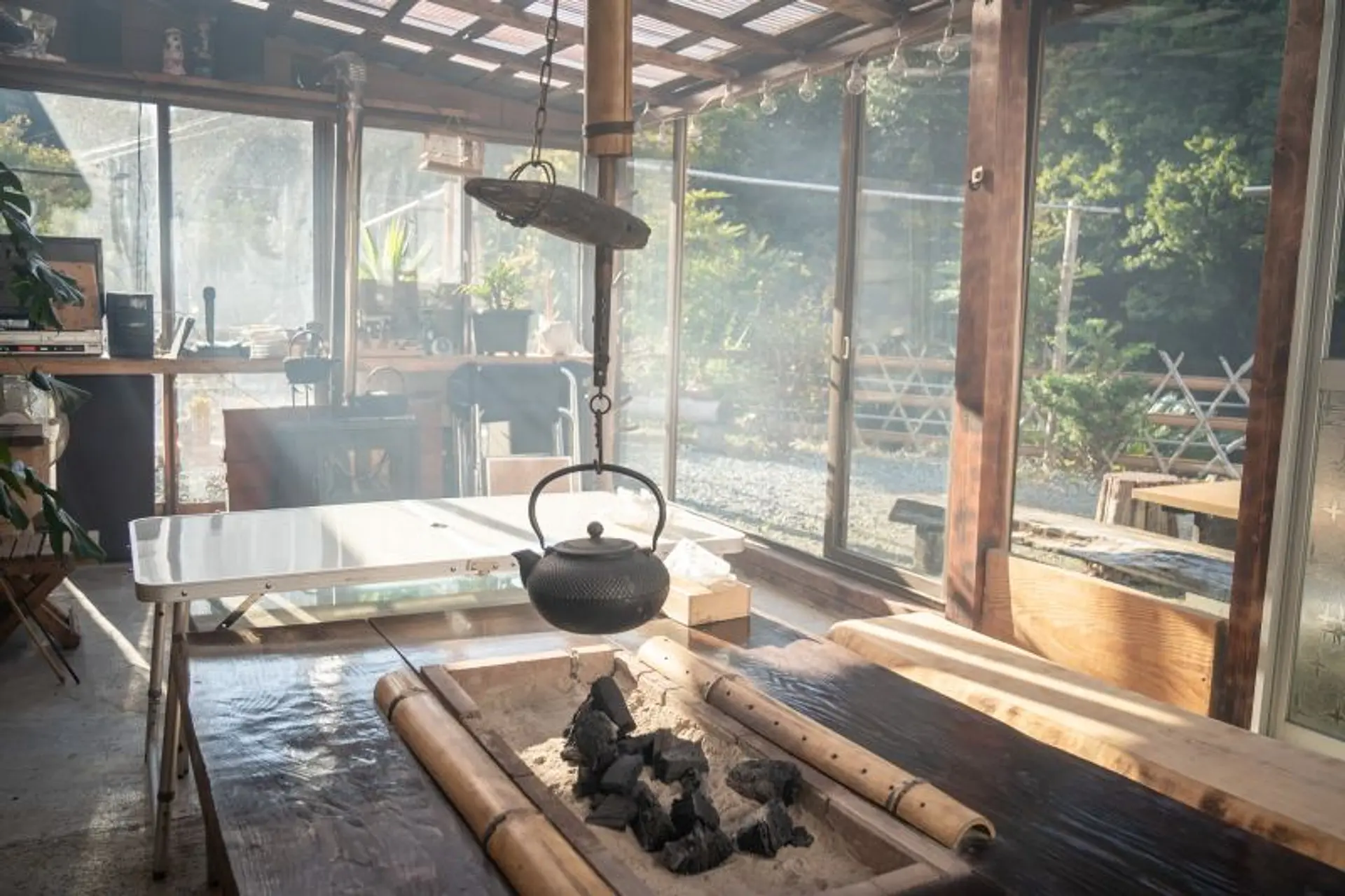 木木屋では自分たちが川や畑で採った食材を囲炉裏(いろり)小屋の炭火で食べることができるんです!