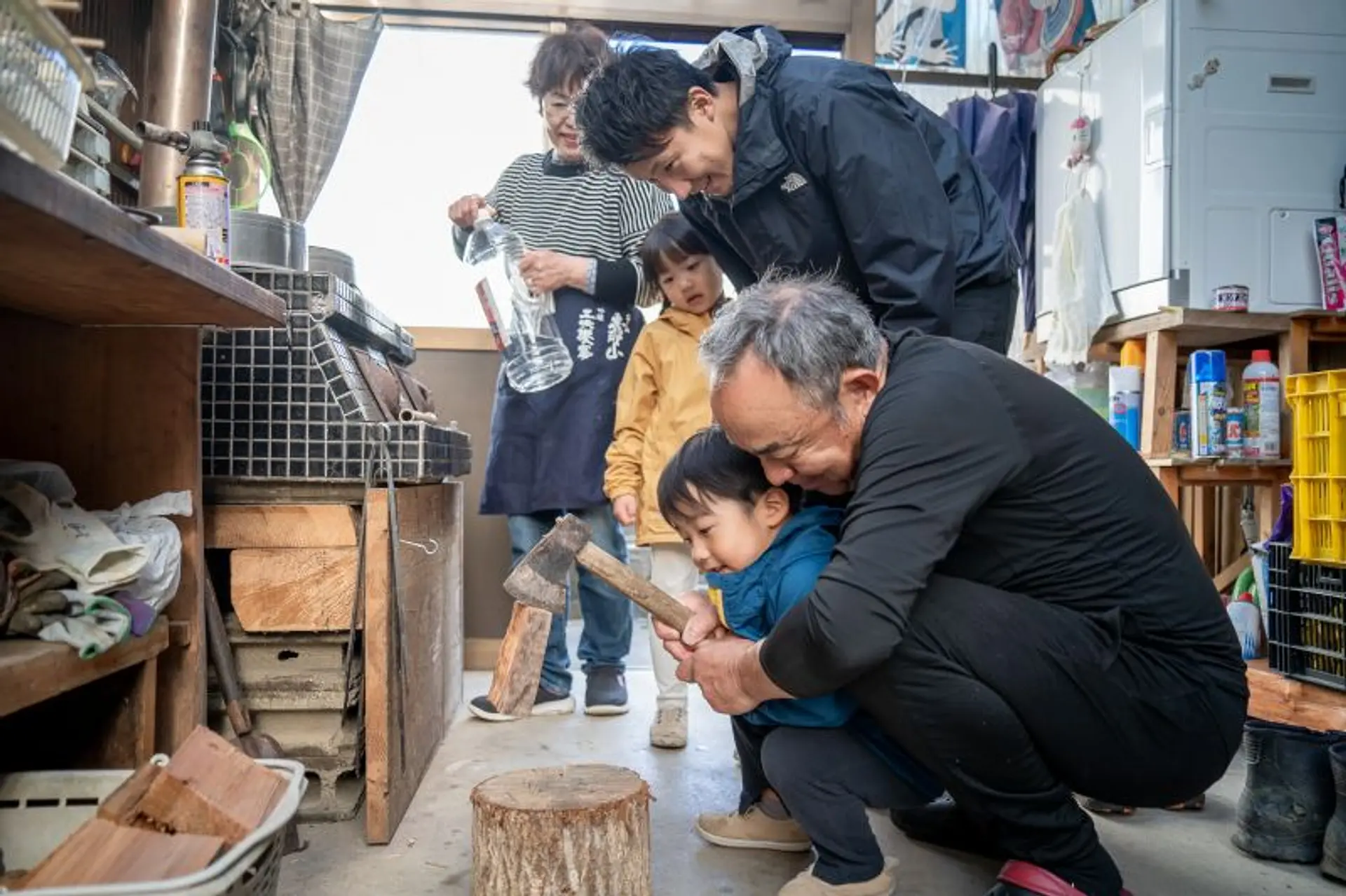 一方の息子は、かまどの火をおこすために薪割りに挑戦。