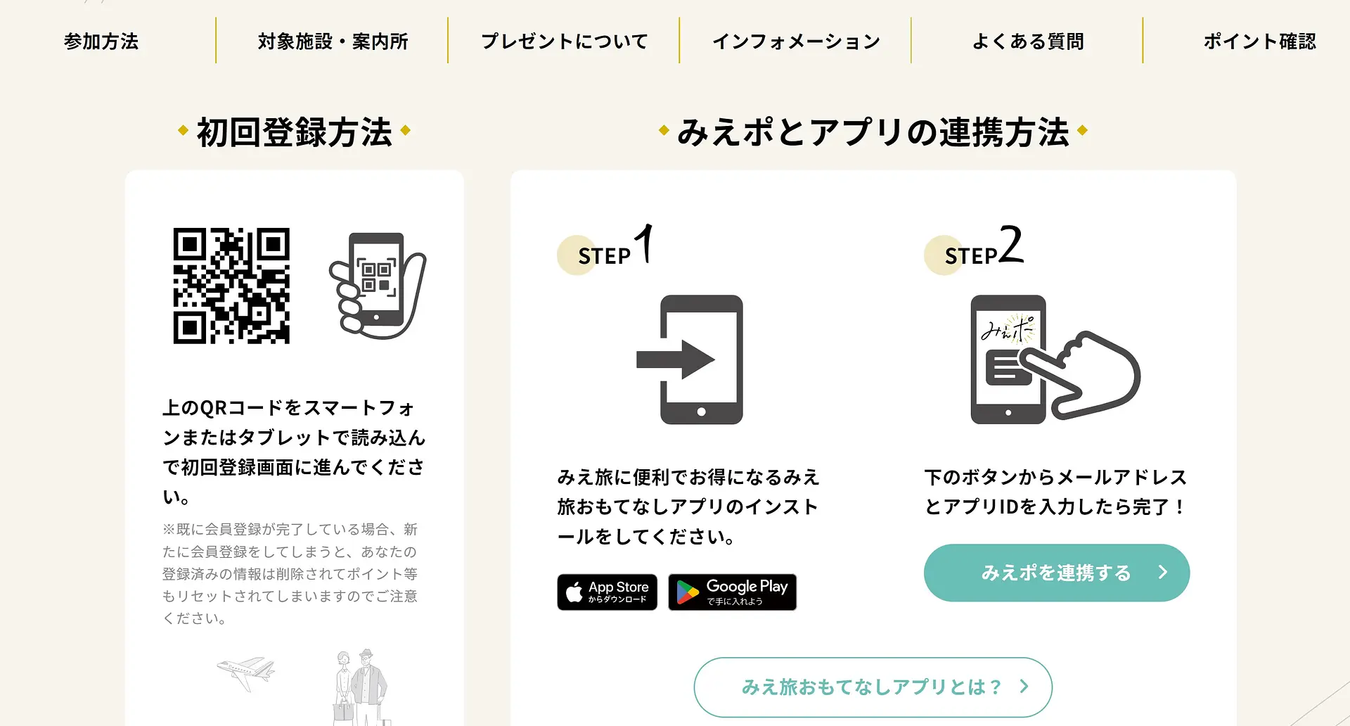 次にみえポの公式サイト でアプリを連携させると5みえポが貯まり、連携後に、みえ旅おもてなし施設やみえ旅案内所を利用してアンケートに回答すると1みえポが貯まるので、効率的にみえポを貯めてスペシャル特典の抽選にチャレンジ!