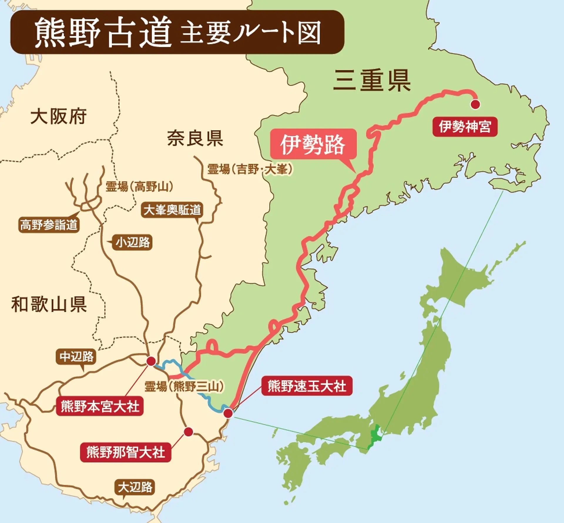 2004年には、ユネスコの世界文化遺産にも登録された紀伊山地の霊場と参詣道。熊野古道には「伊勢路(いせじ)」「中辺路(なかへち)」「小辺路(こへち)」「大辺路(おおへち)」「高野参詣道(こうやさんけいみち)」「大峯奥駈道(おおみねおくがけみち)」という6つのルートが存在しています。