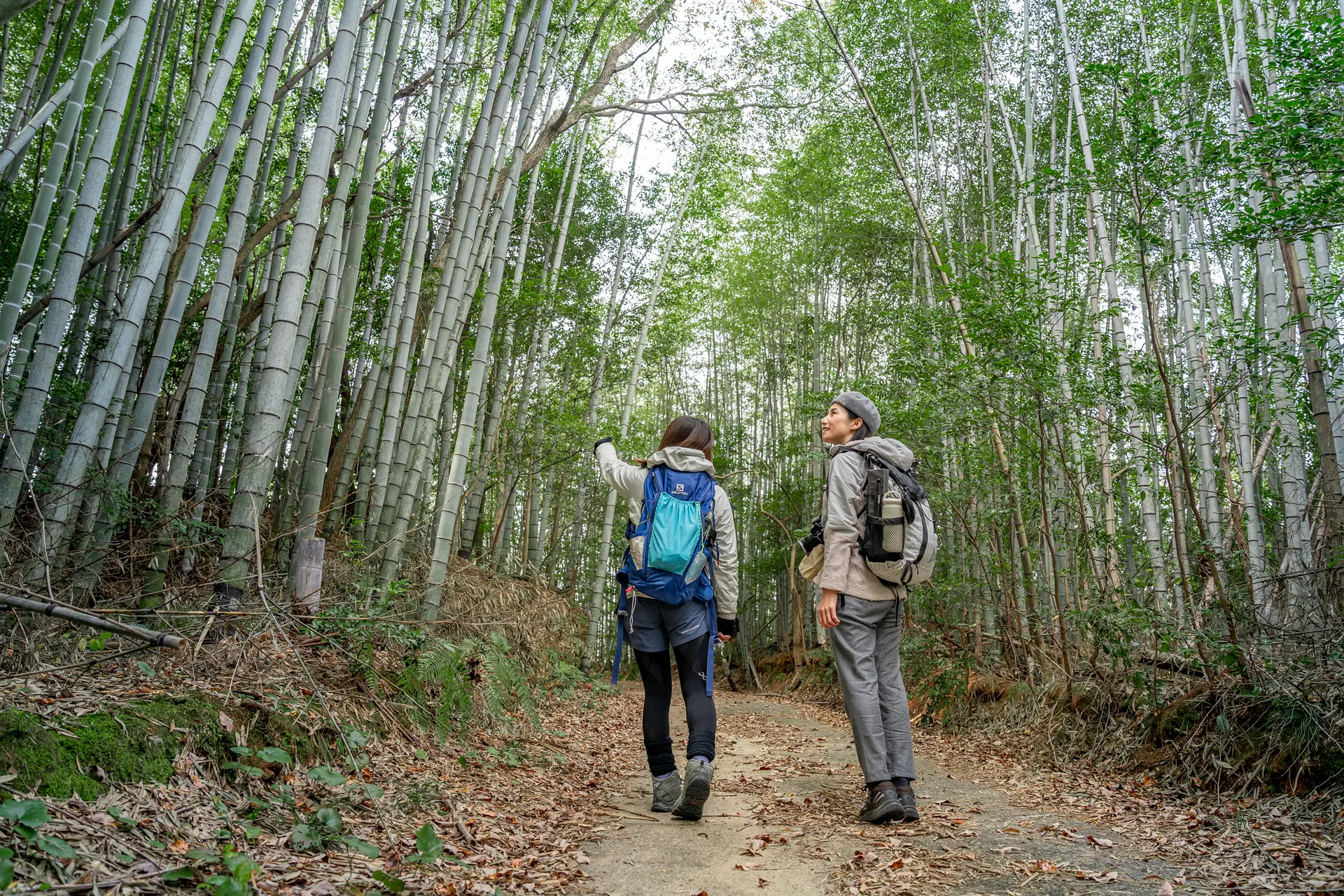 道の左右には竹や杉、ヒノキの林が広がり、頂上からはこれから分け入る紀伊山地の山々を眺めることもできます。