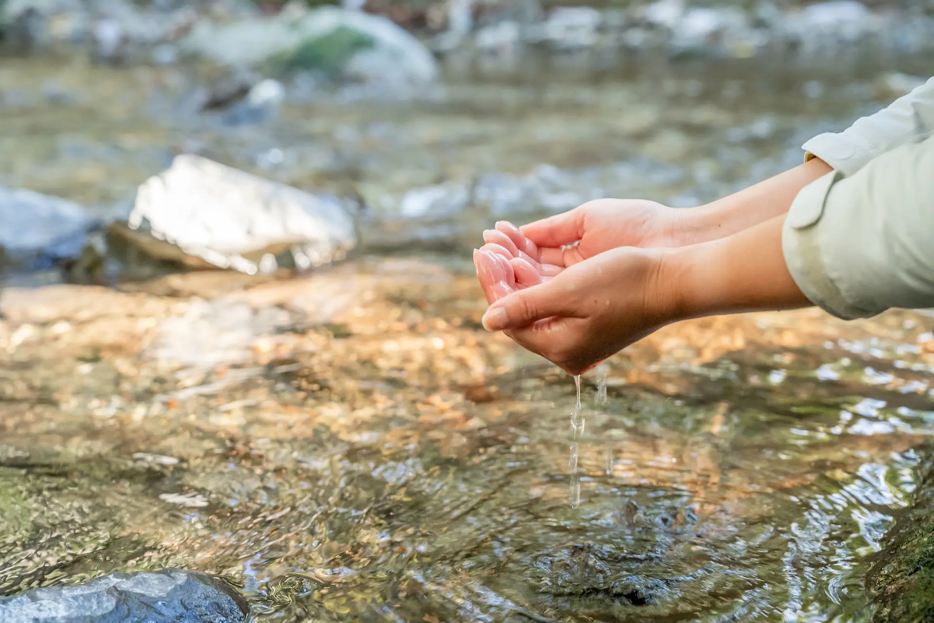透き通った川で手を清めると、歩いて火照った体に、水の冷たさがとても心地よく感じられます。