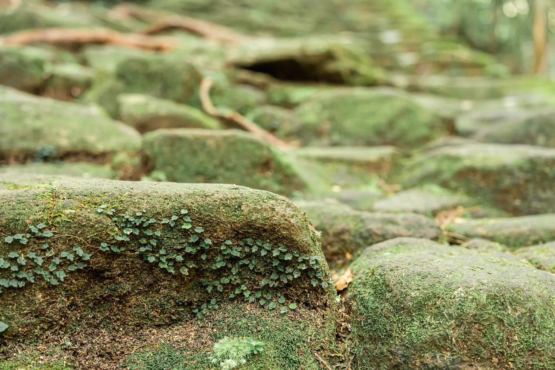 雨が多く降る紀伊半島では、水害から道を守るための知恵として、自然石を利用した石畳を敷きました。