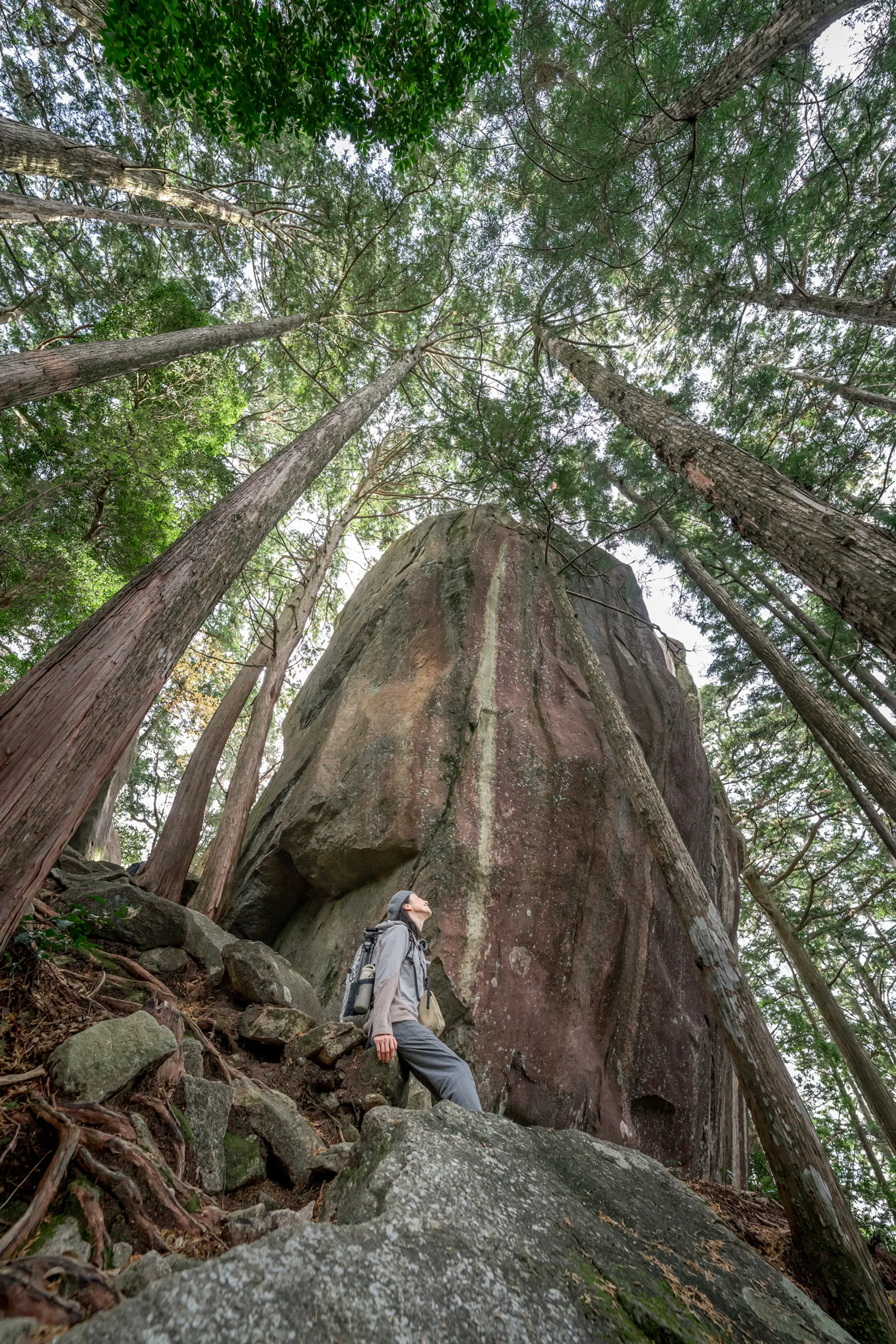 階段が続く険しい山道を、ひたすら登った先に見えてくるのは……超・巨大な「天狗岩」!