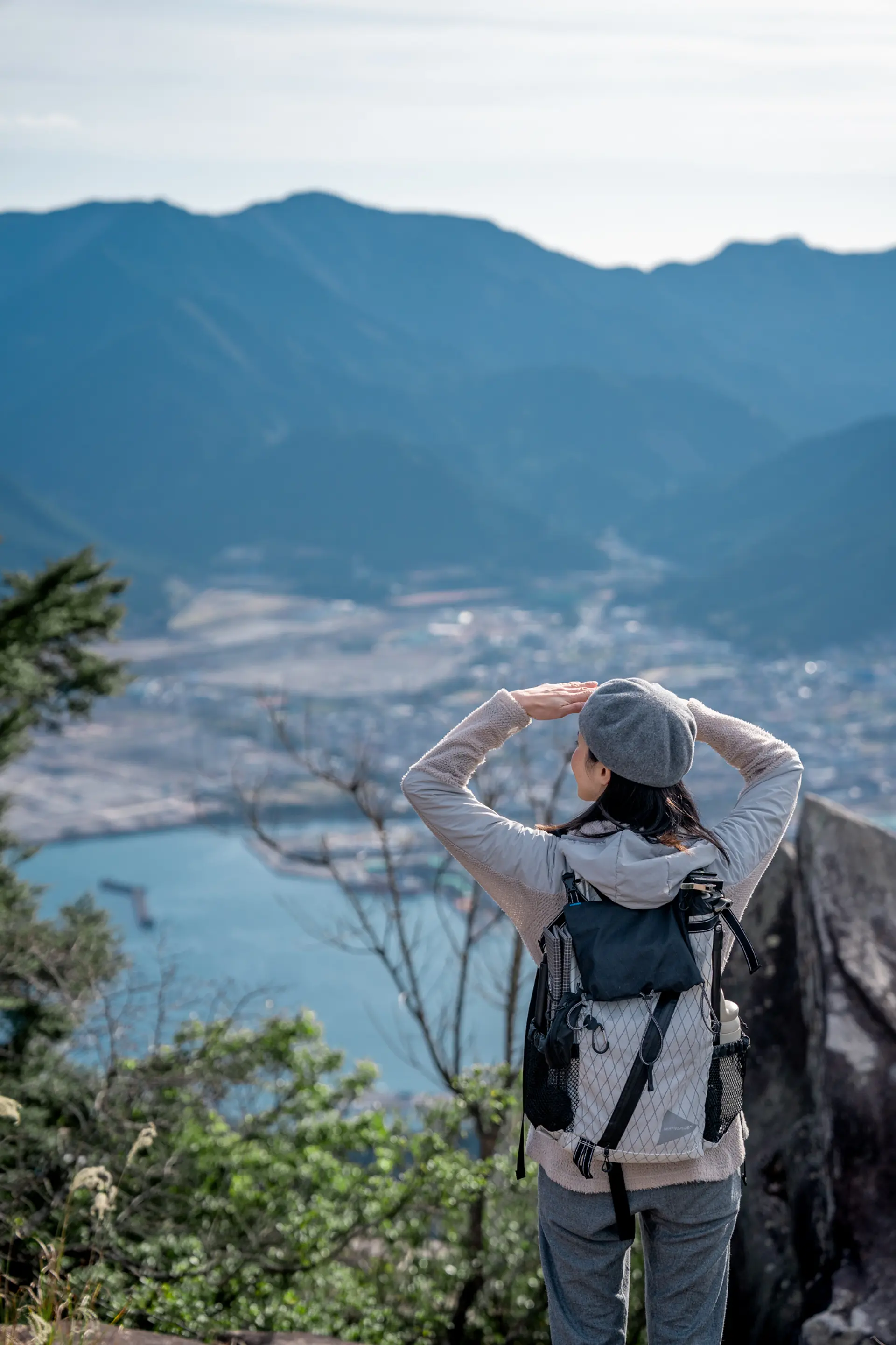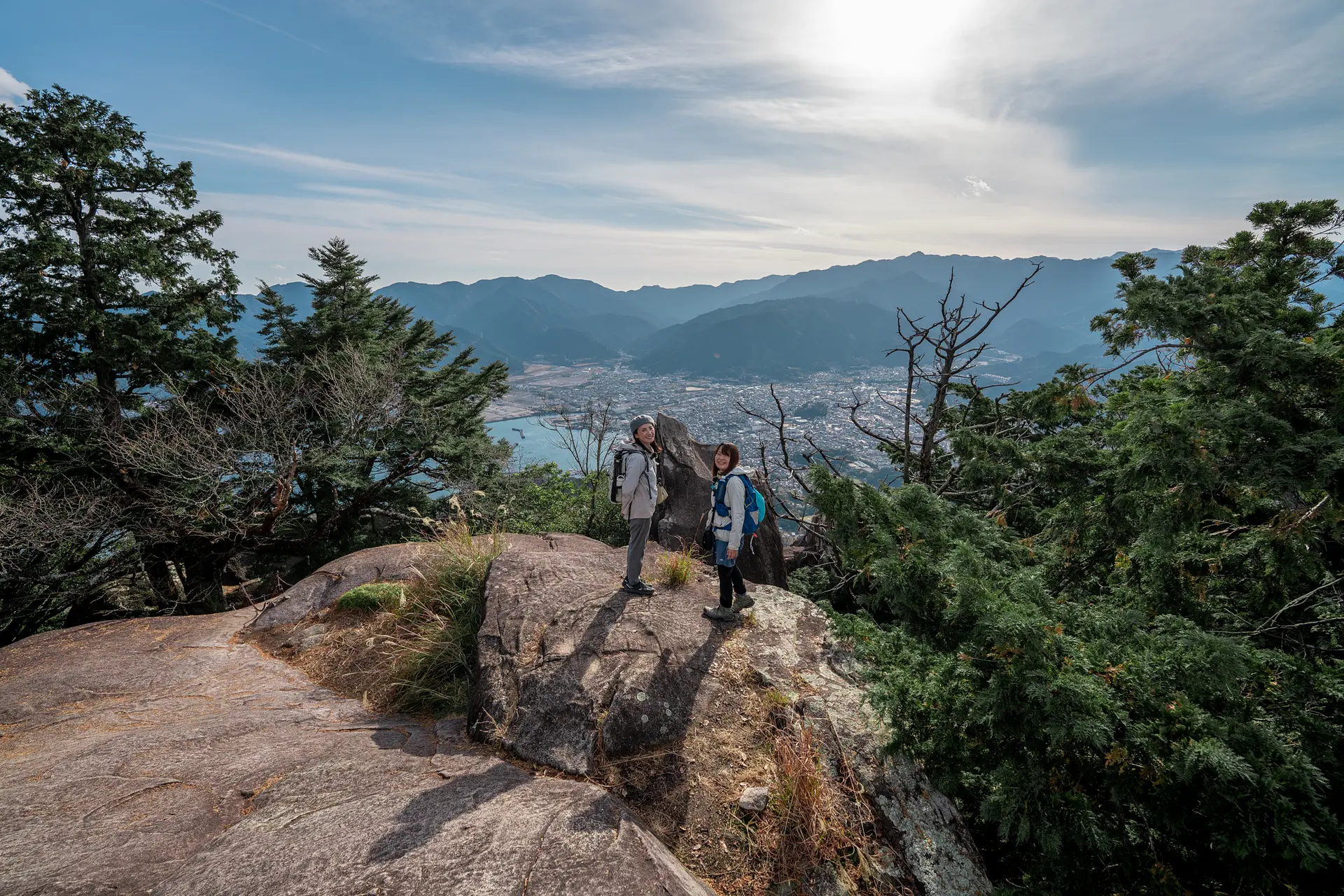 岩の上に立つと見えるのは、尾鷲の町並みと熊野灘、そして日本百名山の大台ヶ原山のパノラマの絶景!