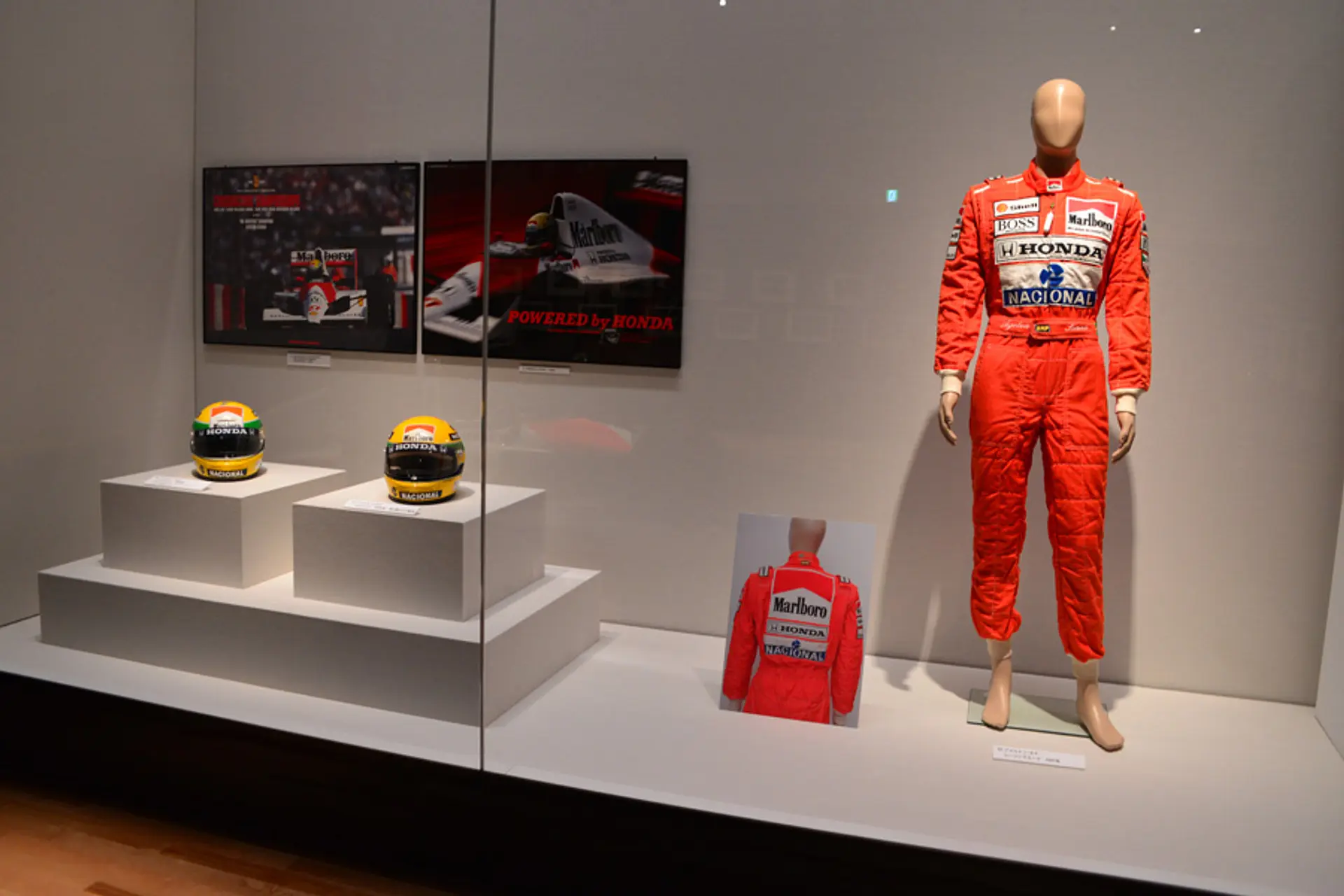 セナが着ていたドライビングスーツにヘルメットも展示してあります。