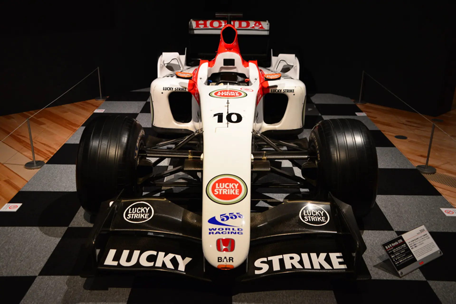 登場時のカラーリングに驚いた方も多いのではないでしょうか、Honda RA107です。シャシーまでオールホンダの時期で、いかにも挑戦するホンダを現すマシンでした。カラーリングの中に字がびっしり。ぜひ実物をご覧ください。