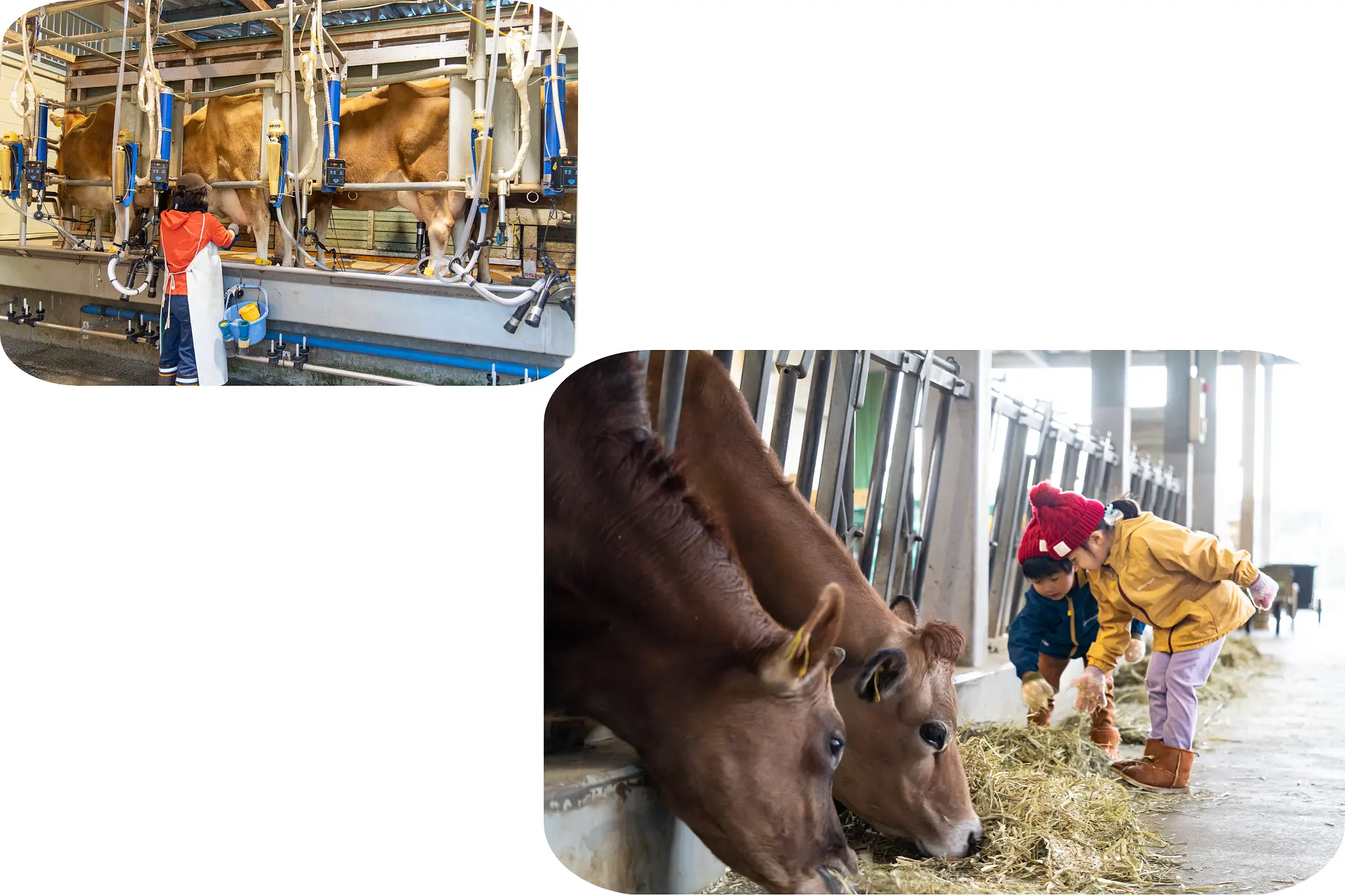 牛さんたちが食べやすいように牧草を配ったり、乳搾りに挑戦したりと大忙し!