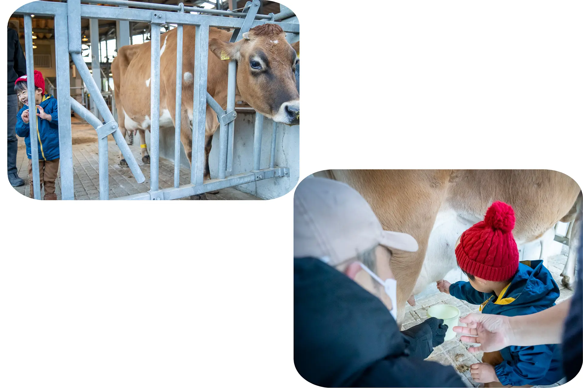 ファーム内には、ジャージー牛たちも暮らしており、乳搾り体験は毎日開催しています。