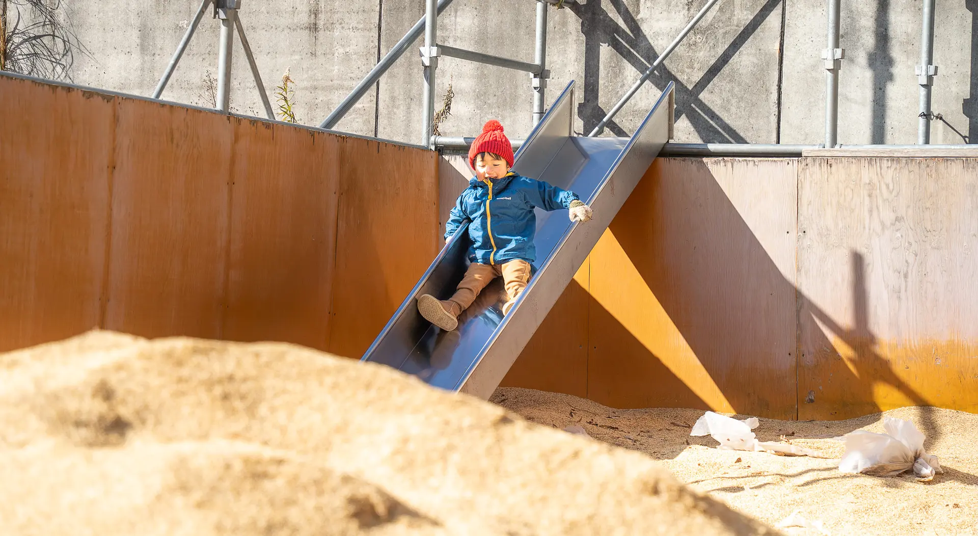 すべり台でもみがらに向かって滑ったり、スコップで山を作ってみたりと遊び方は無数にあります。