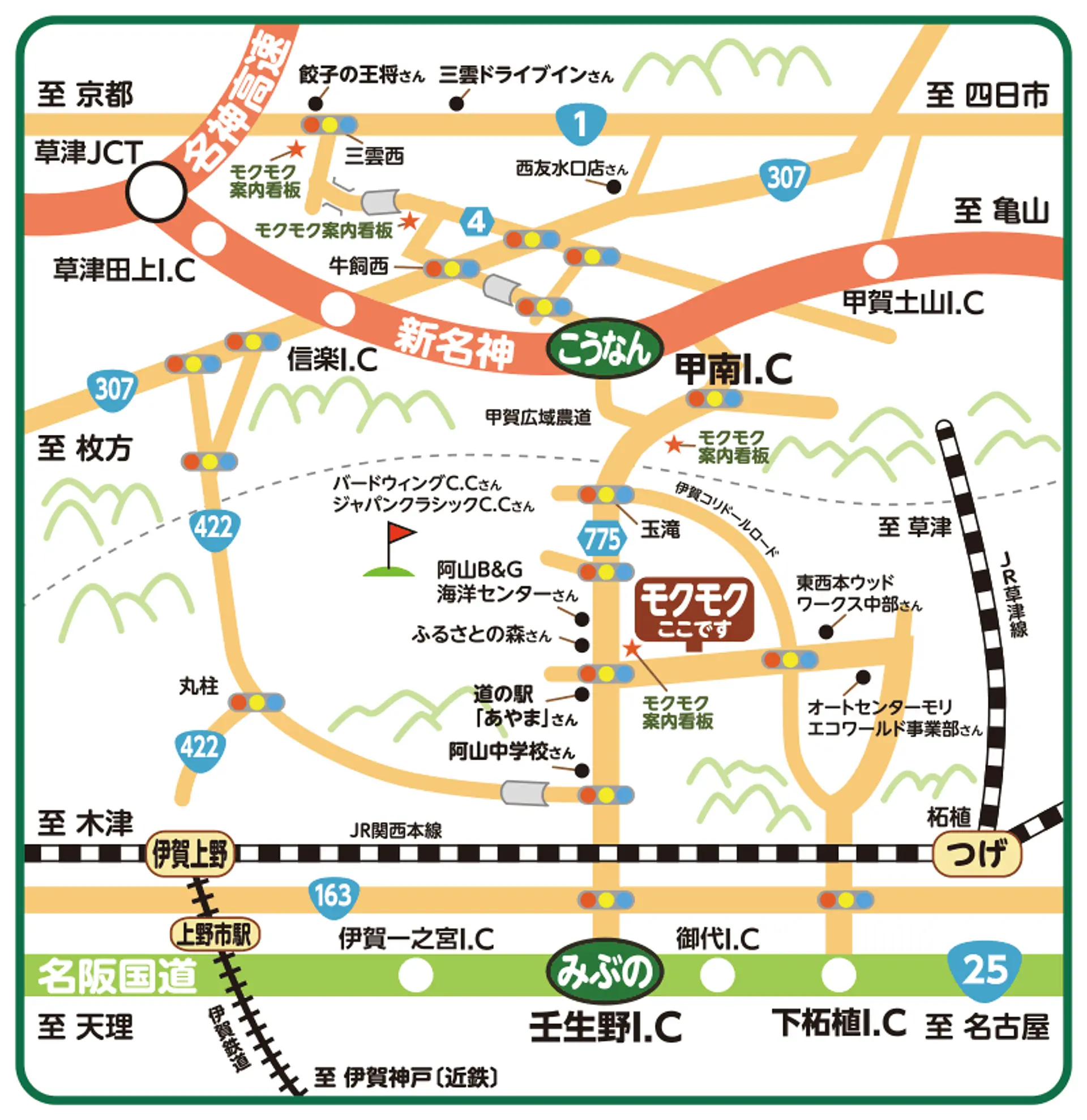 津•伊勢方面からは、東名阪自動車道経由で名阪国道「壬生野IC」から車で約10分
