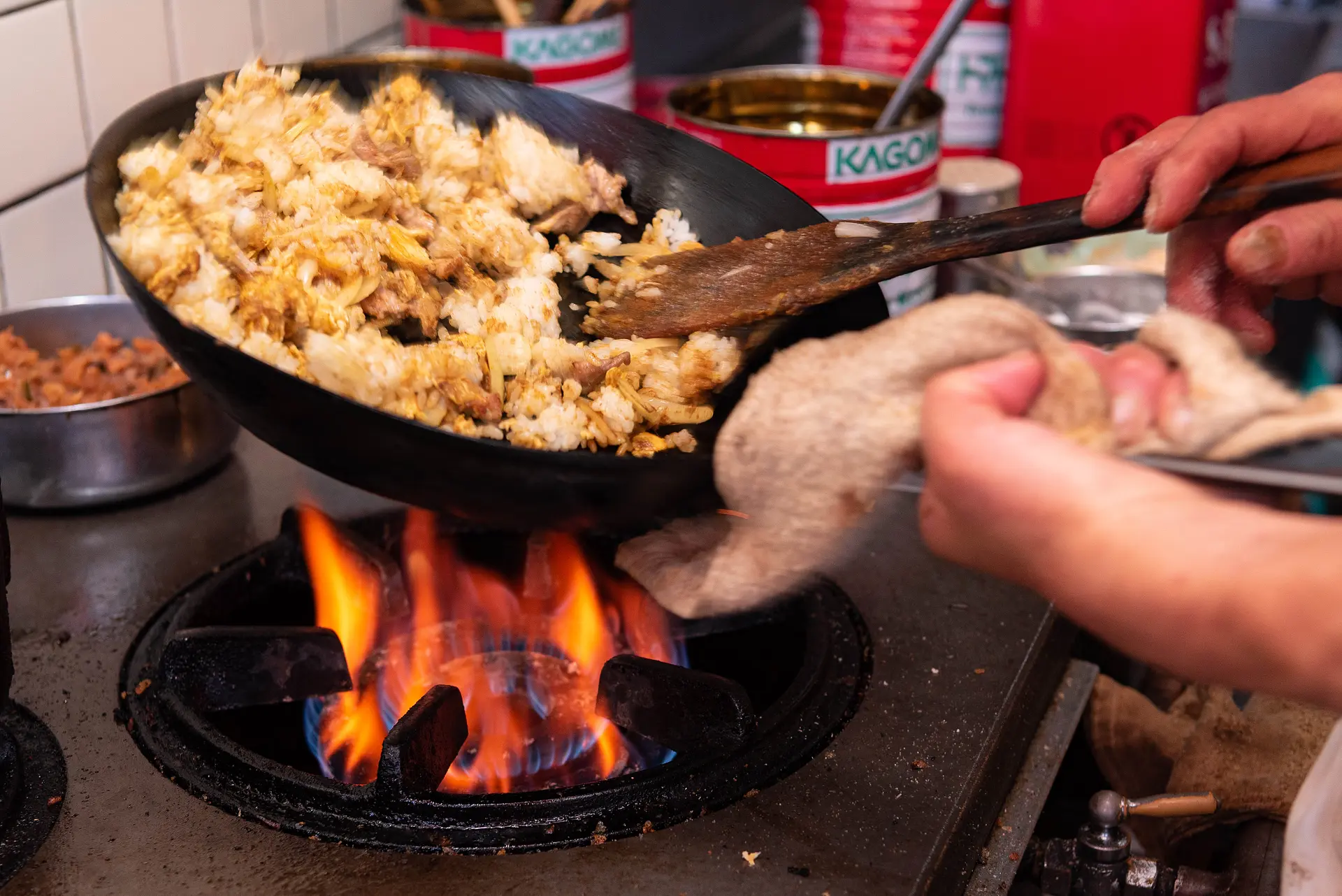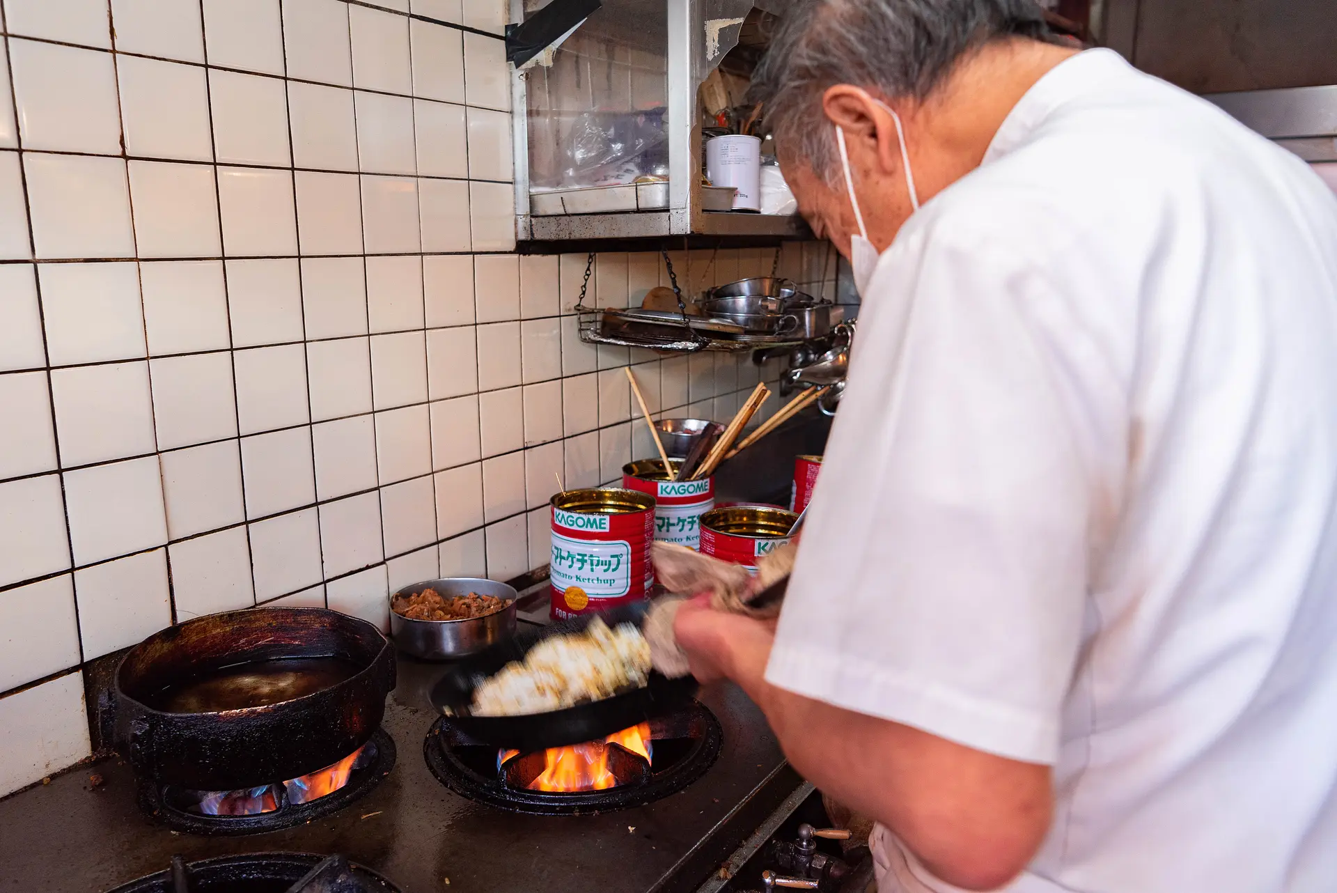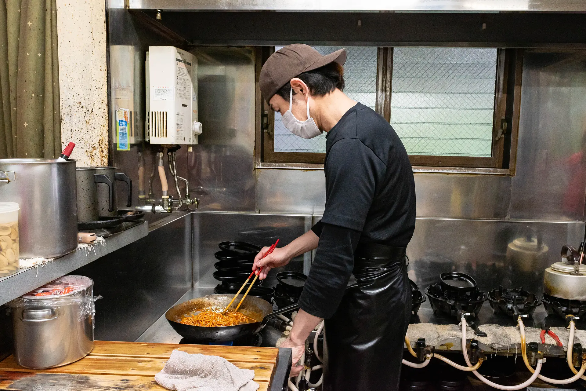 麺を多めの油で炒めたら、ケチャップベースの秘伝のソースをたっぷりとまとわせ、直火で熱せられた鉄板の上に載せます。