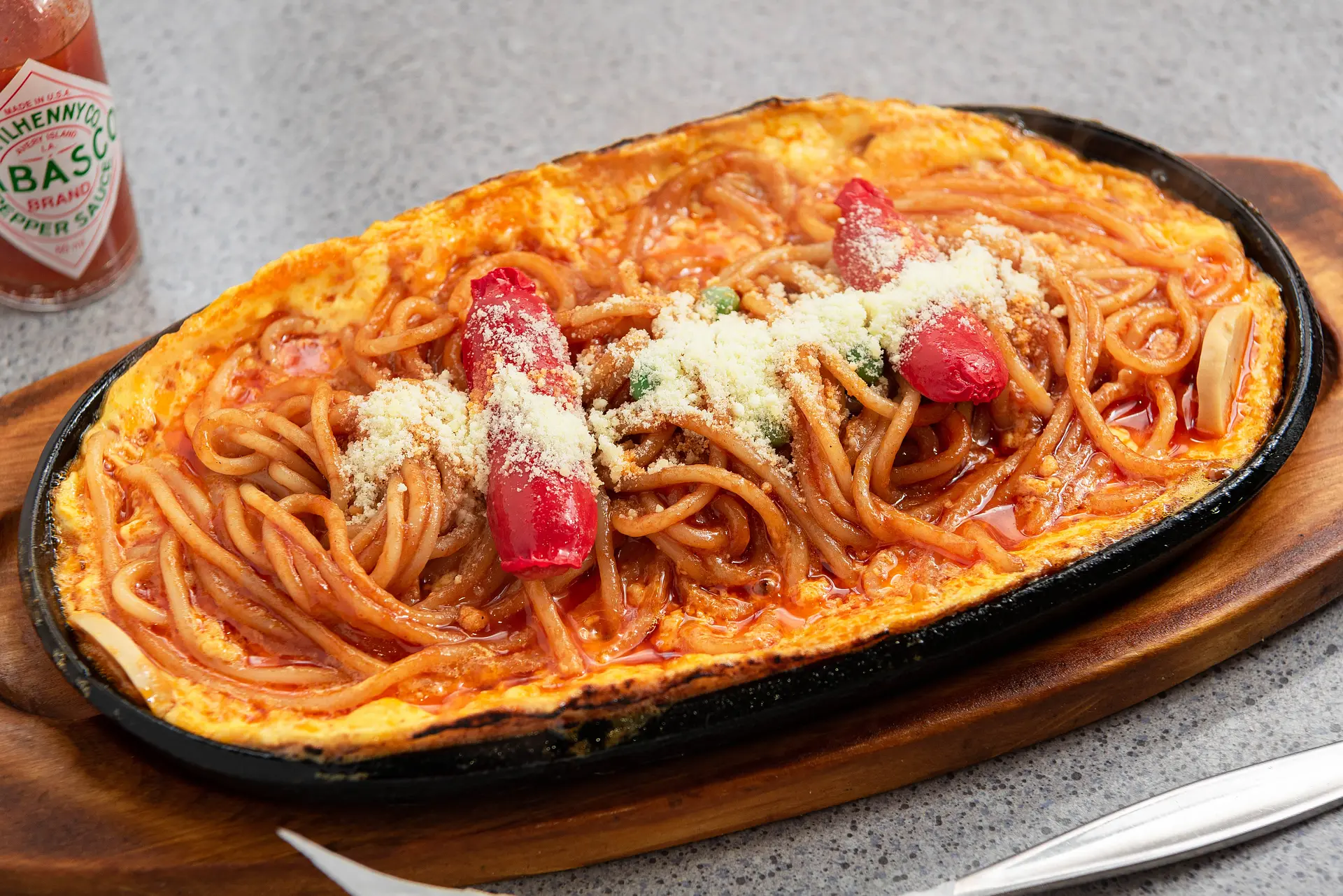 熱々の鉄板で提供される、喫茶モリの「モリスパ」!