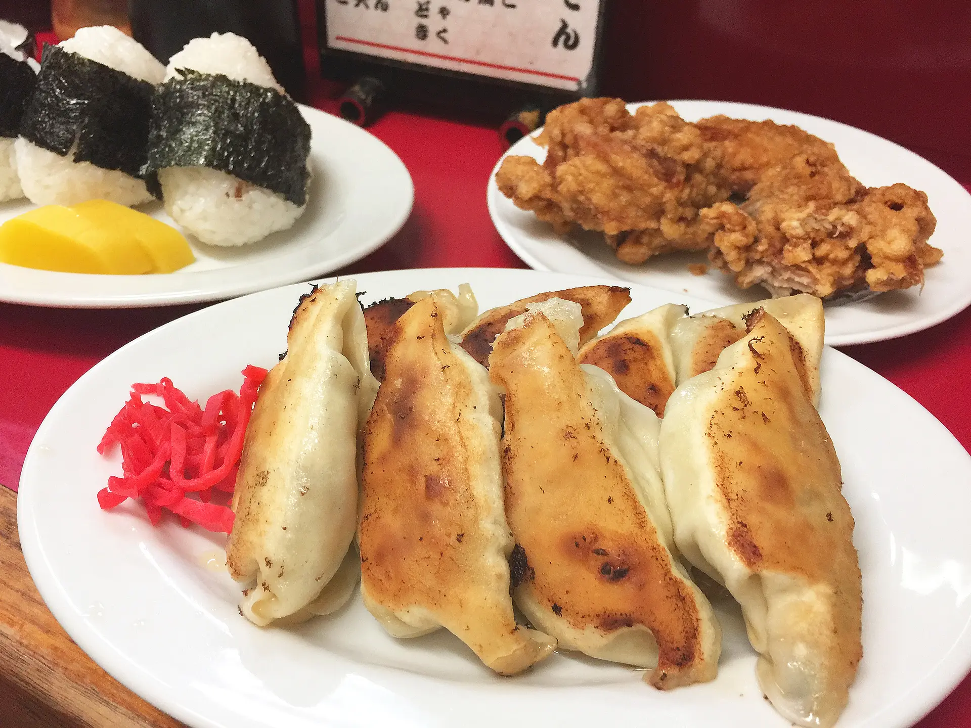 餃子と一緒におすすめなのが、大ぶりの骨付き地鶏をカラリと揚げた「からあげ(写真は小450円・大は800円)」と、口の中でご飯がほどける絶妙なにぎり加減の「おにぎり(鮭、おかか、梅の3個、480円)」。もちろんビールもあるので、お酒が好きな人はぜひどうぞ。