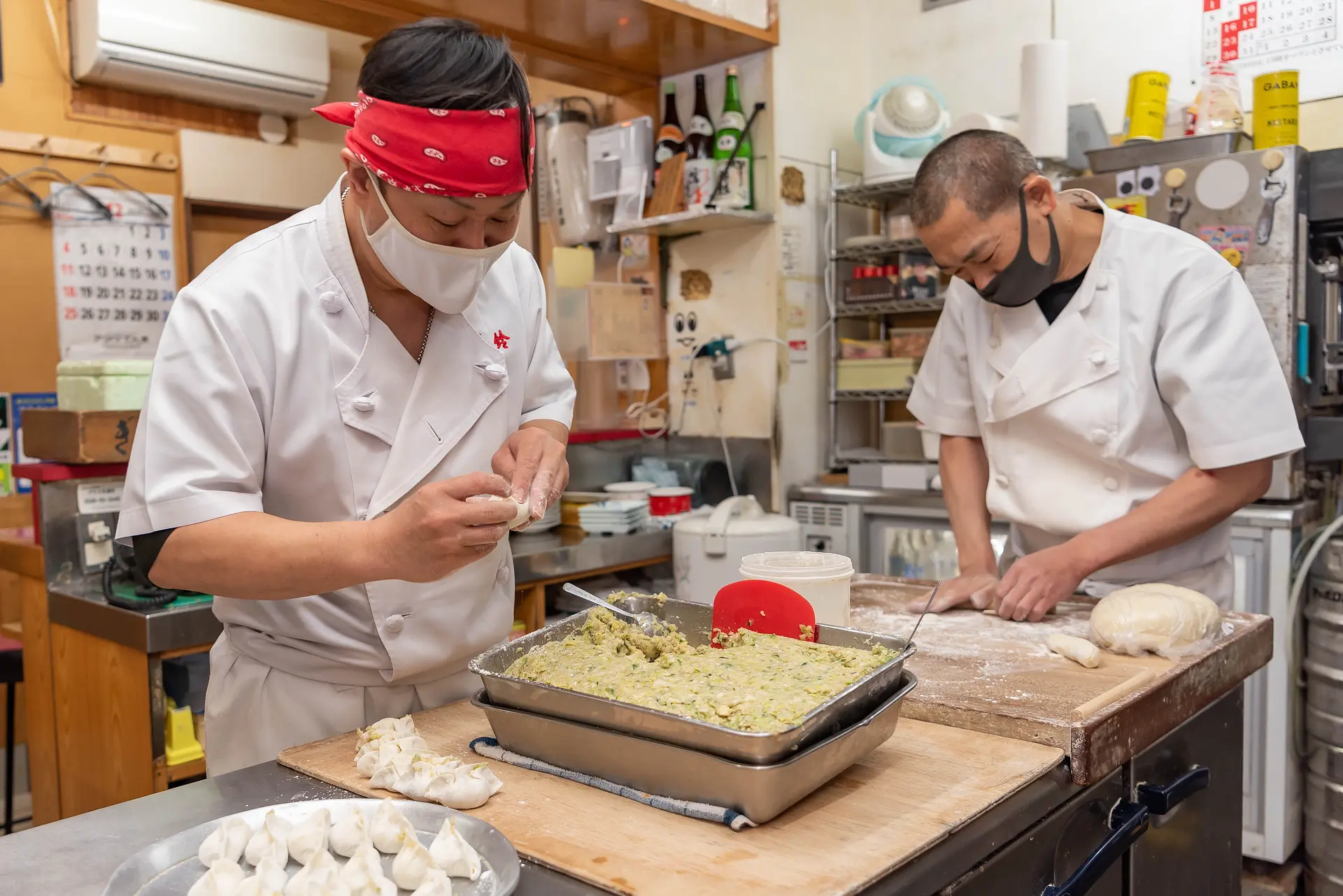 小麦粉の塊を小さく切り分け、麺棒でひとつひとつ伸ばして皮を作るところから作業が行われます。キャベツや白菜がたっぷり入った肉あんを皮で包んだら、すぐにフライパンで焼き上げます。抜群のチームワークで流れるように進む手際の良さは、いつ見てもほれぼれ。