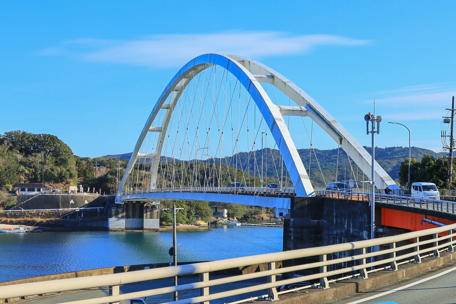 パールロードの入口はアーチ型の真っ白な「麻生(おう)の浦大橋」で、海を間近に感じる絶景ポイント!橋からの眺めがこちら↓
