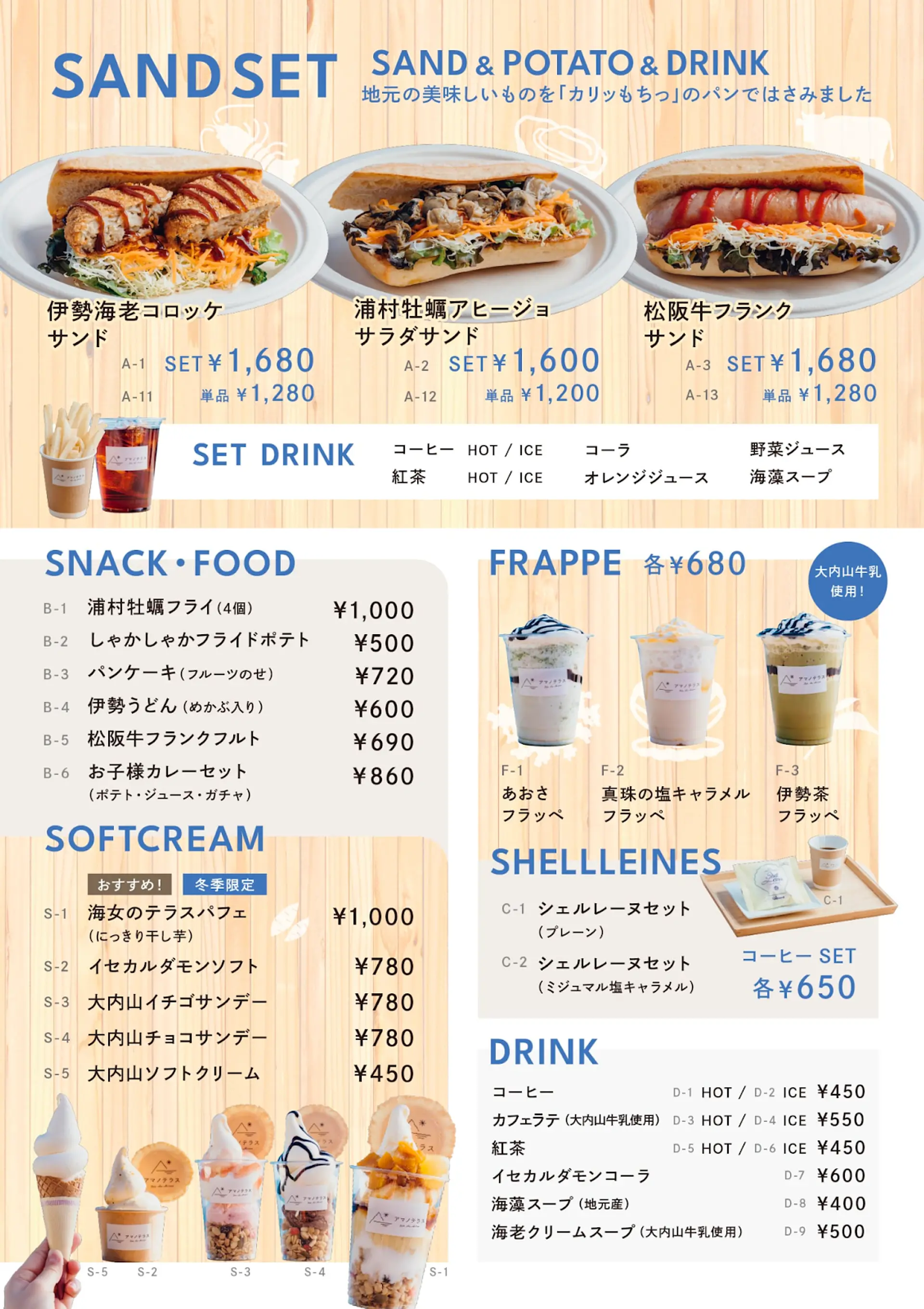 カフェメニューには伊勢志摩の食材を使ったサンドイッチやフラッペ、パフェなどがあり、松阪牛を使ったフランクフルトもあるなど、ランチやデザートにぴったりのメニューが勢揃い!