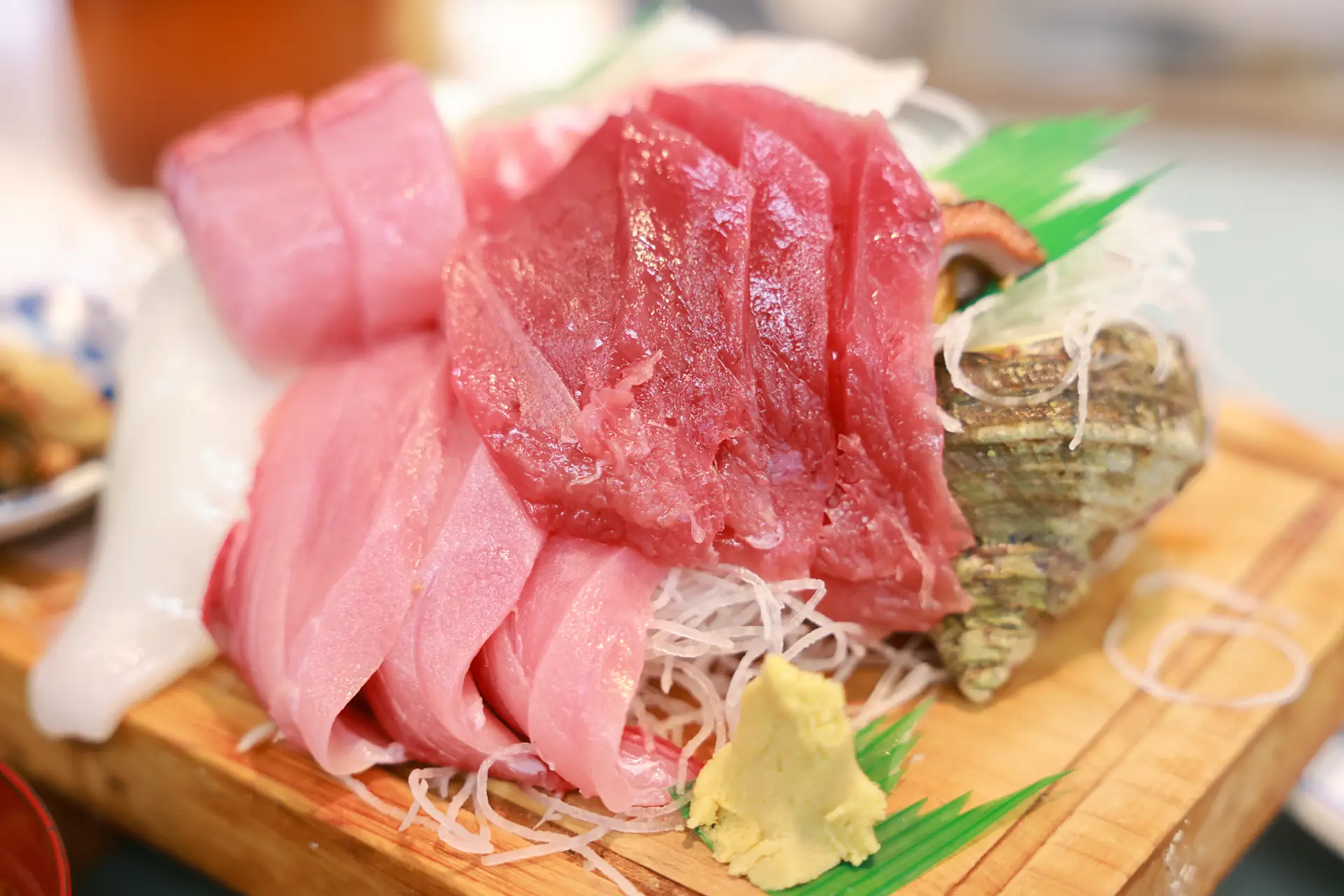 カツオ・イカ・ブリのお刺身、サザエのお造り、煮魚、お味噌汁、ご飯は一杯までおかわり無料という大ボリュームに衝撃!