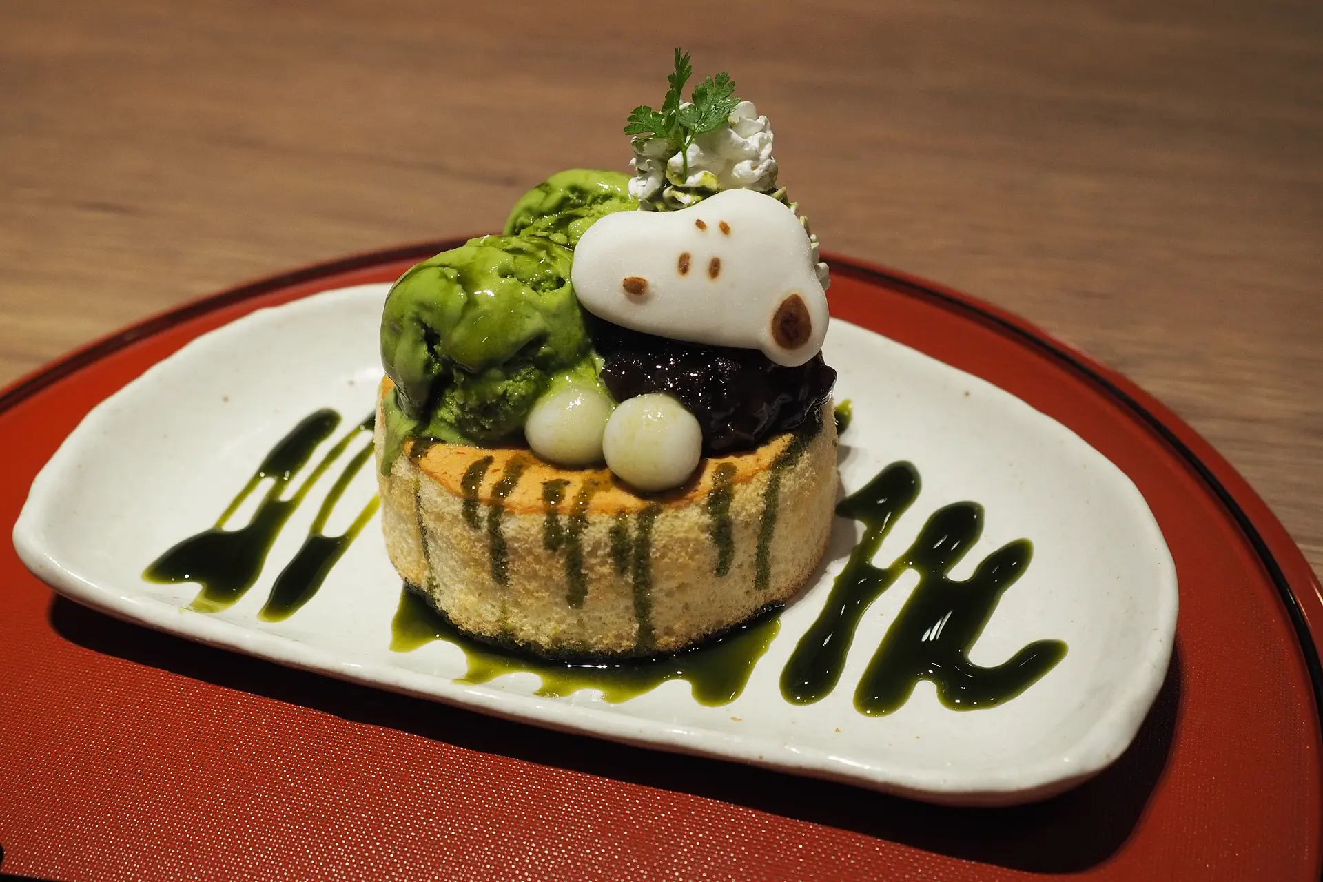そして、「スヌーピー厚焼きパンケーキ」。白玉がスヌーピーの足になっていて、とてもかわいい!ふんわりとしたパンケーキに、濃いめの抹茶シロップがかかり美味しかったです。