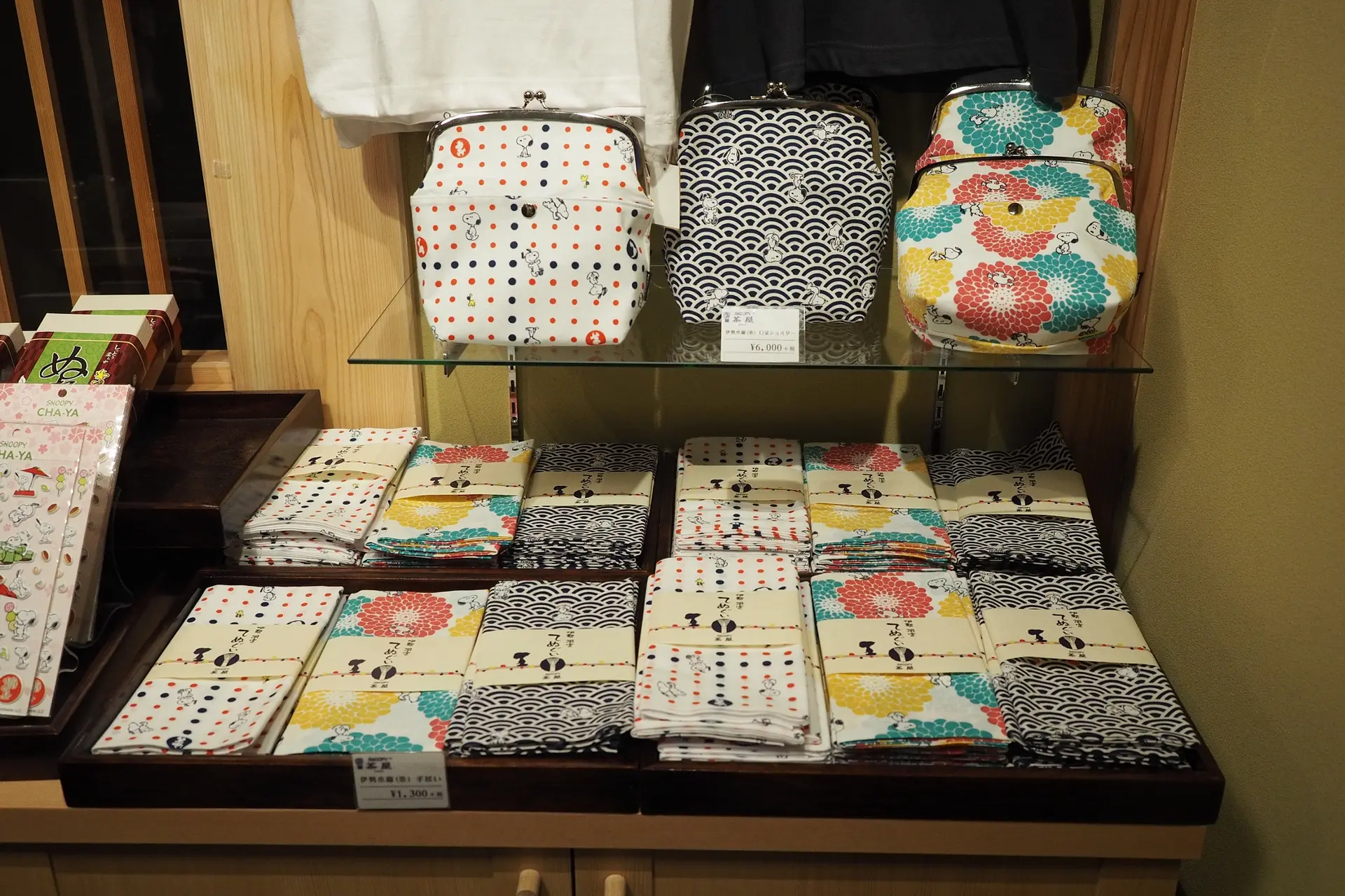 こちらが伊勢限定の「伊勢木綿」を使ったグッズ。伊勢木綿はかわいい柄が多いのですが、そこにスヌーピーが加わって、さらにかわいくなります!ここでしか買えない財布やバッグなどもあるのですが、取材当日は人気があり売り切れでした…。次に来た際に買おうと思っています。