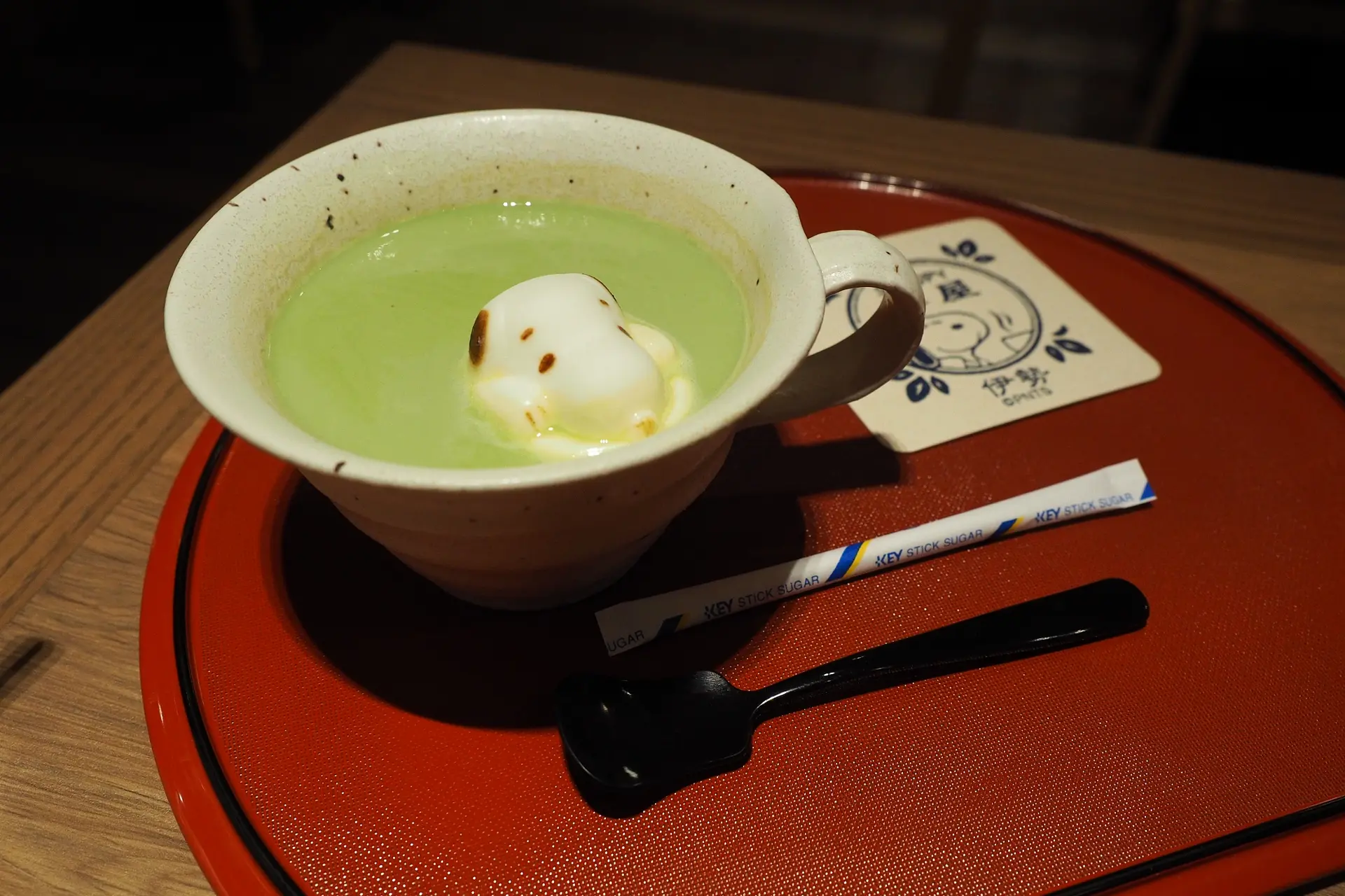 スヌーピー茶屋の名前のとおり、こちらが甘味とお食事ができるお店。まずは「スヌーピー抹茶ラテ」のホットを注文しましたが、マシュマロでできたスヌーピーが顔を出しています。写真を撮るのに一生懸命になること間違いなしです。