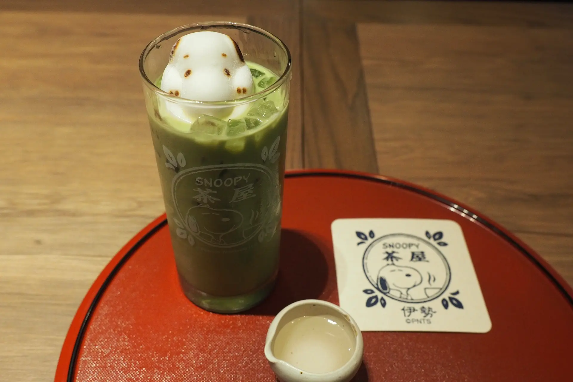 こちらは「スヌーピー抹茶ラテ」のアイスです。これもスヌーピーが顔を出してくれています。右に写っているコースターは持ち帰ることができますので、お土産として記念に持っていけます。