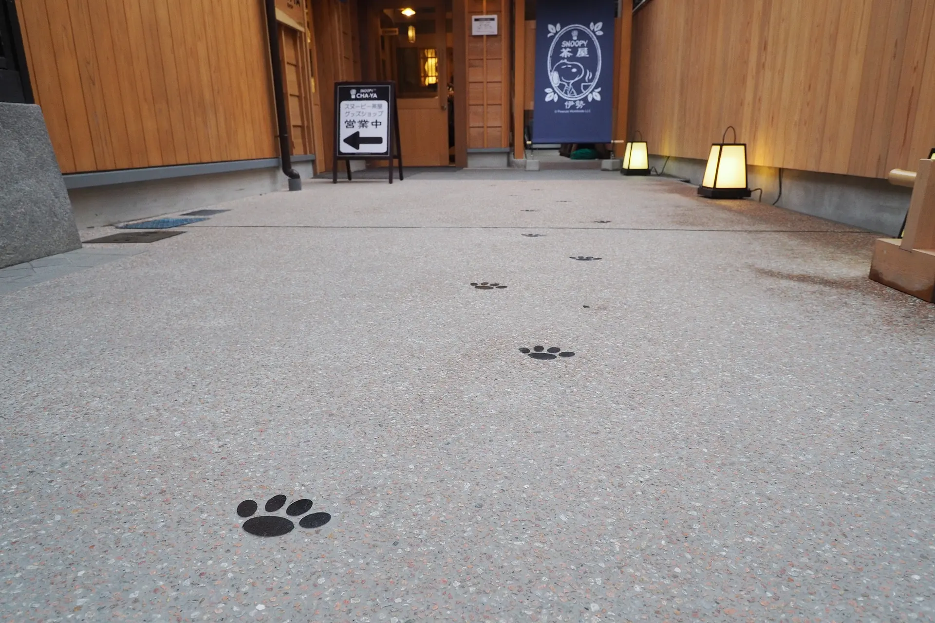 まずはお店の入口の通路の写真から。スヌーピーやチャーリー・ブラウン、ルーシーが和服姿でお出迎えしてくれます。照明にスヌーピーが浮かび上がっているのがわかりますでしょうか?ここで写真撮影されるお客さんもたくさんいらっしゃました。