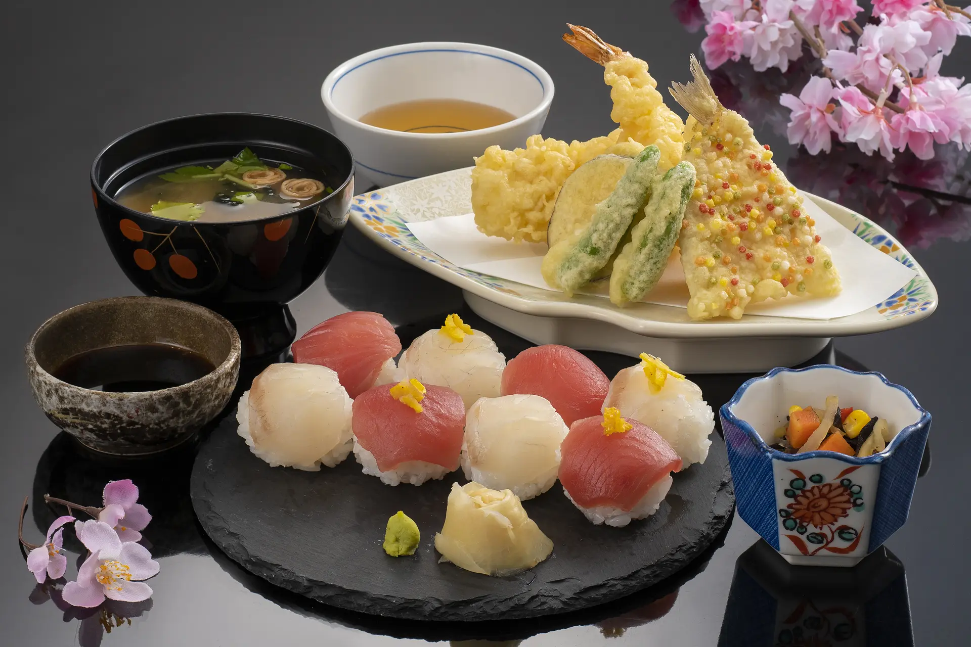 ジャパニーズレストラン「的矢」では、伊勢まだいとマグロを使った「手毬寿司定食」をお楽しみいただけます。