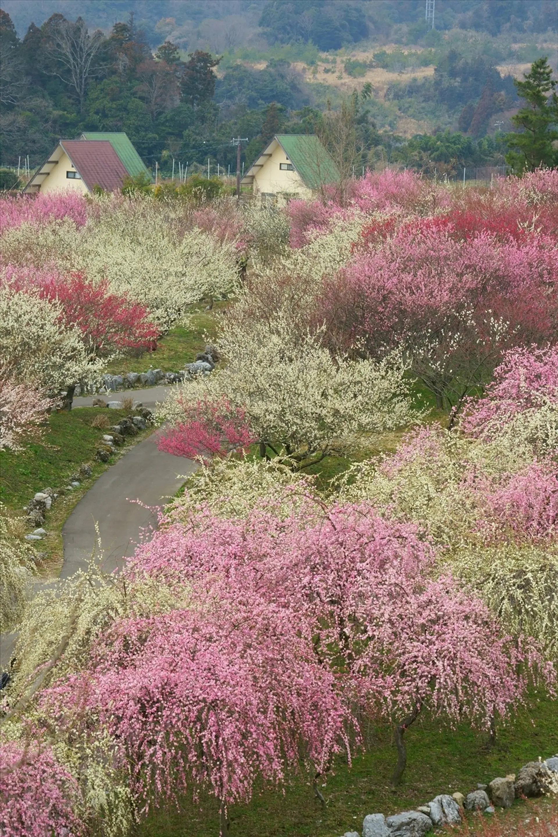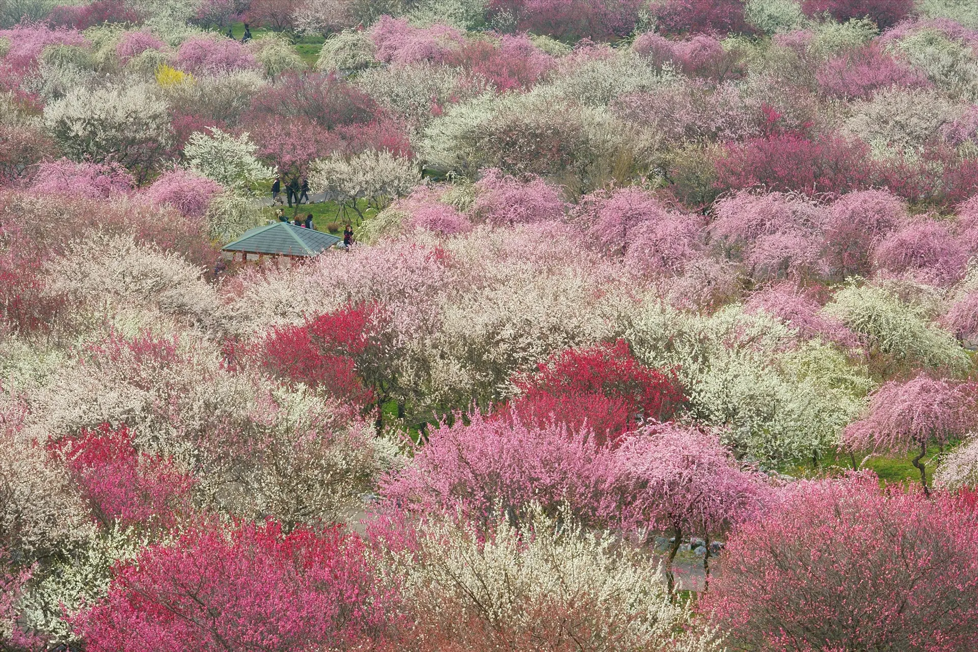 梅林公園を見下ろすことができる見晴台からは、色とりどりの梅の花が咲く様子を一望できます。