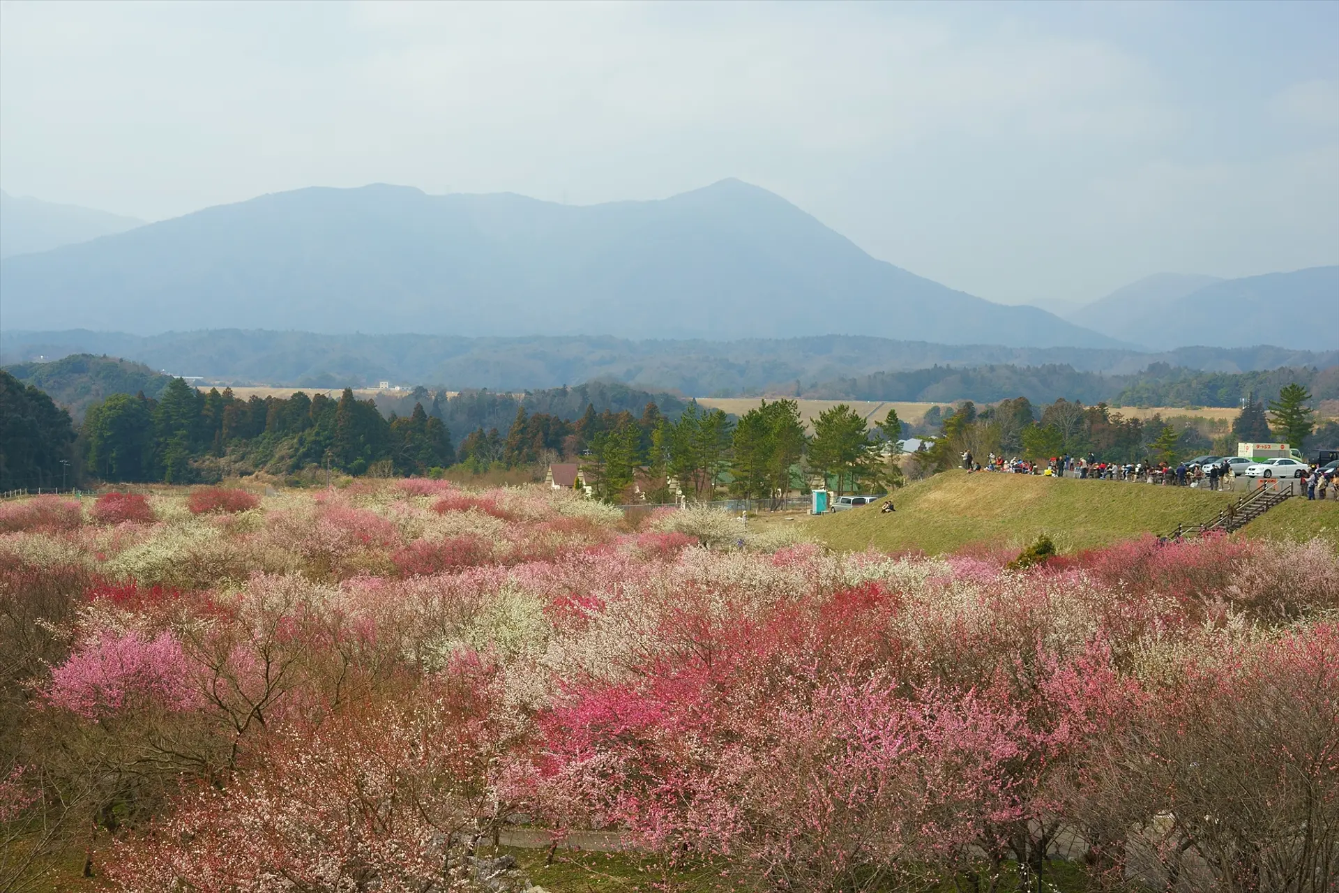 いなべ市農業公園の梅まつりを象徴する梅の絶景は、この見晴台からの景色。写真撮影目的の方で賑わう見晴台には、望遠ズームレンズで撮影される方の姿も。