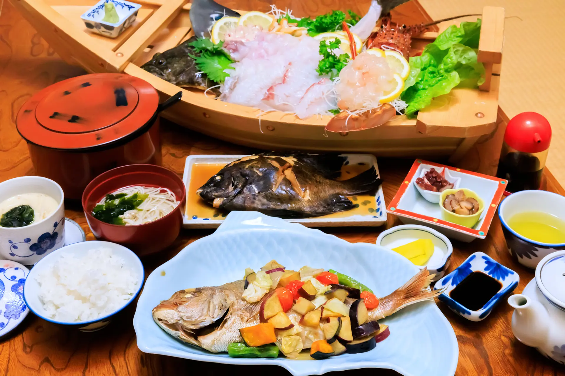 潮騒の宿「山海荘」では神島産の魚介類を使用した食事を楽しめますよ。