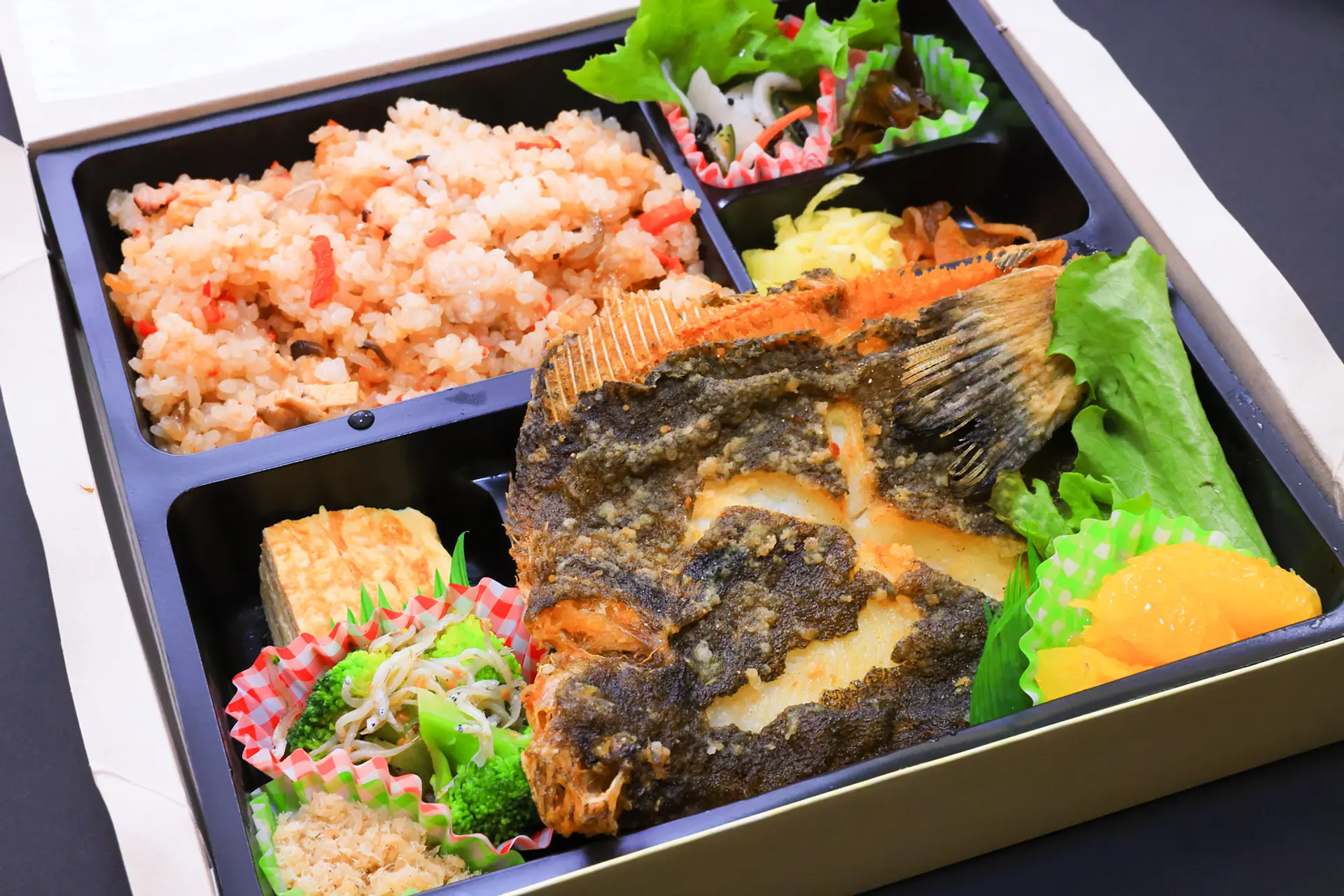 上記写真はお弁当の内容で、タコ飯、焼き魚、だし巻き卵、数種類のお惣菜など、ボリューム満点!
