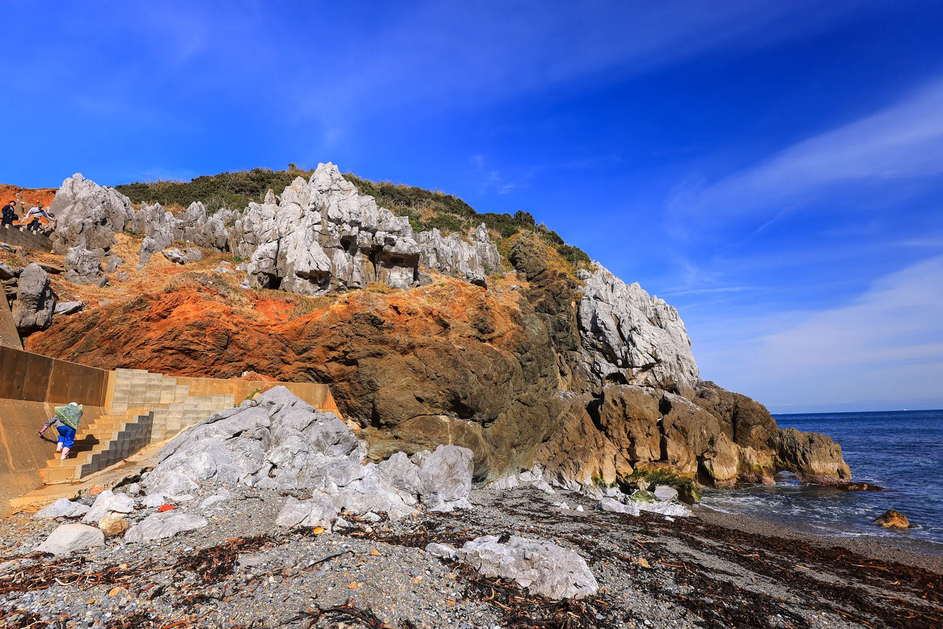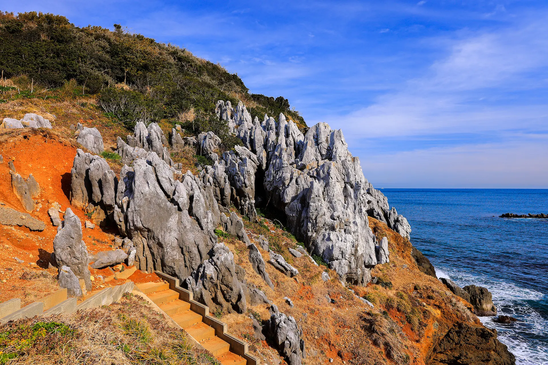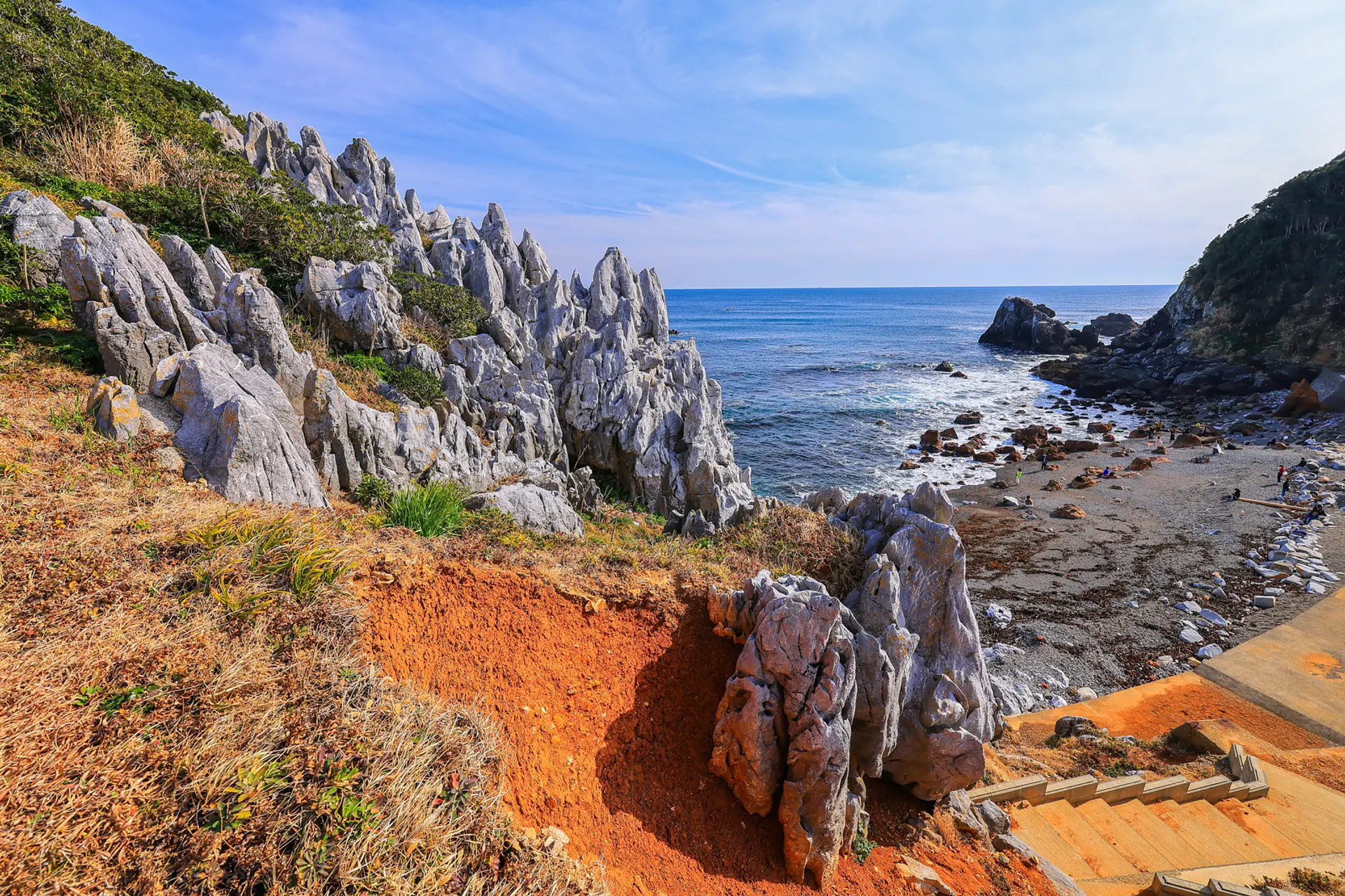 神島には、カルスト地形をはじめとした自然豊かな名所があり、戦時中に建てられた歴史的建造物も見られます。