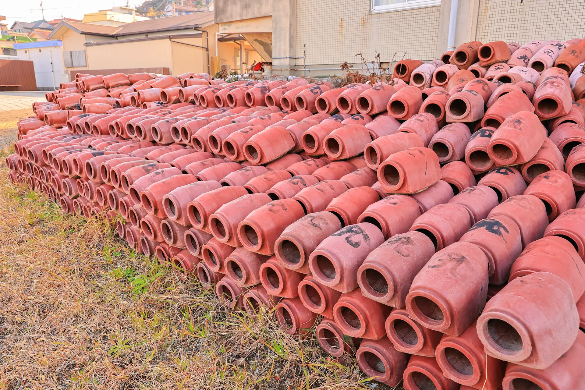 船着き場を出ると、無数の蛸壺がびっしりと並んでいる光景が目に入ります。