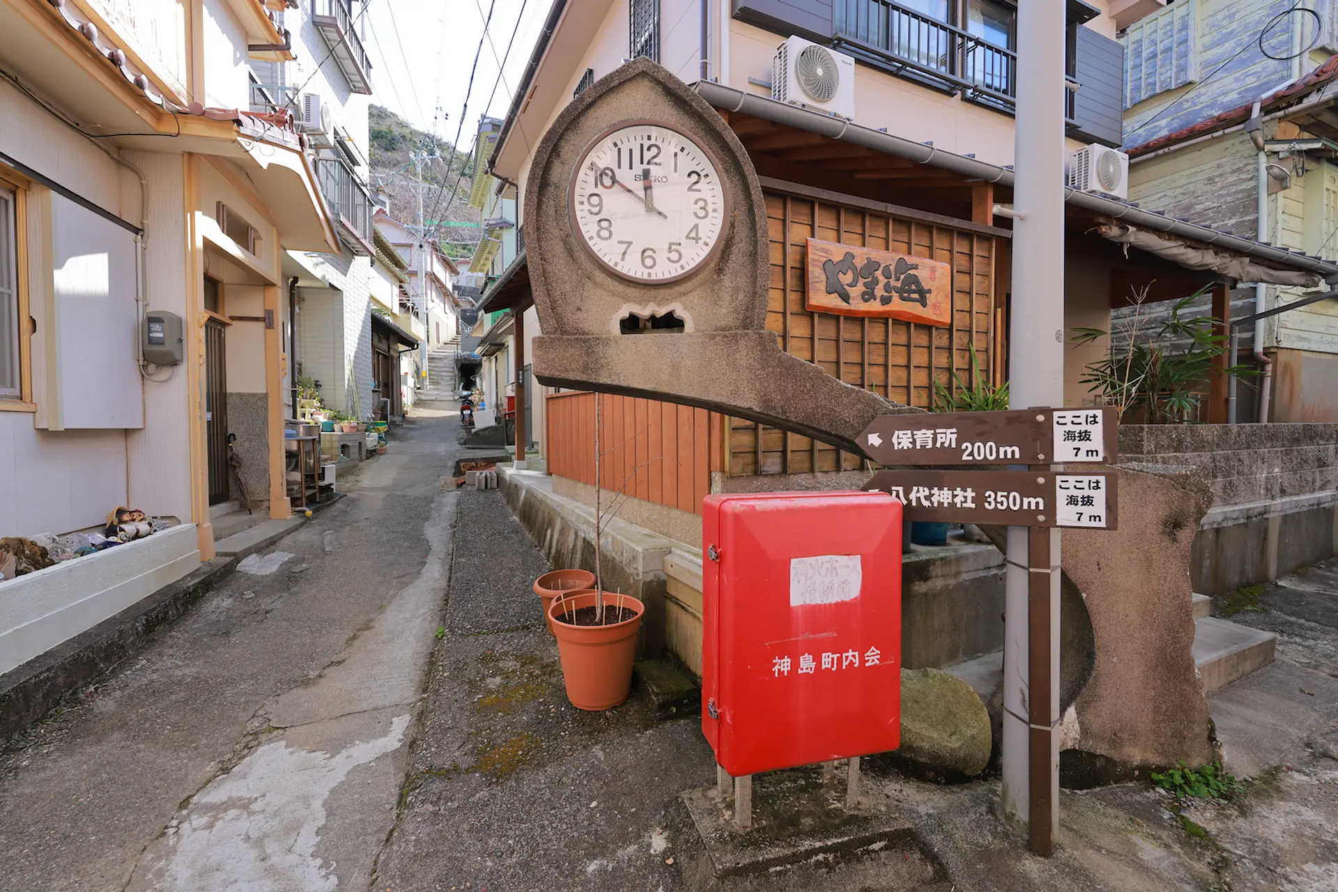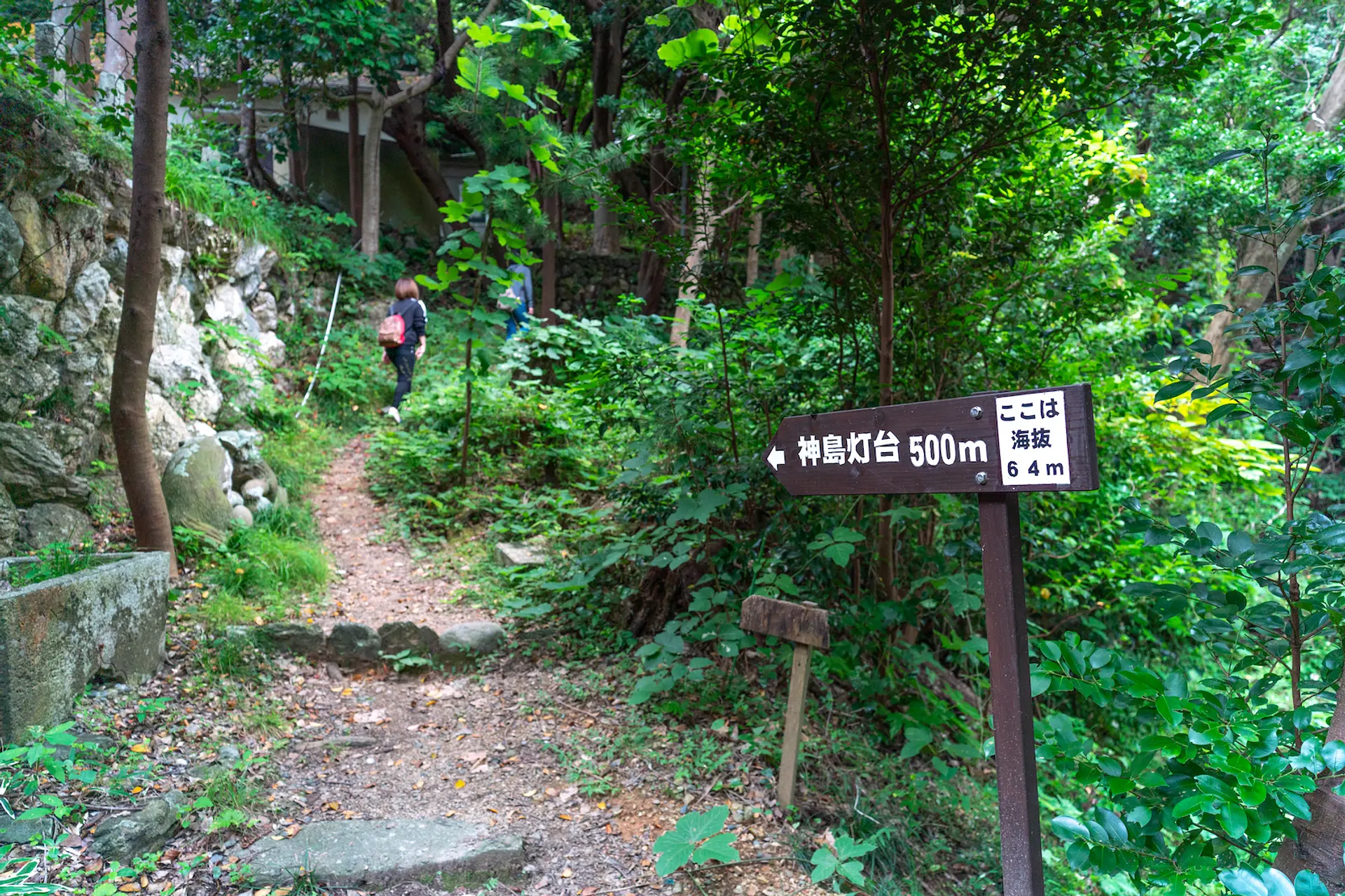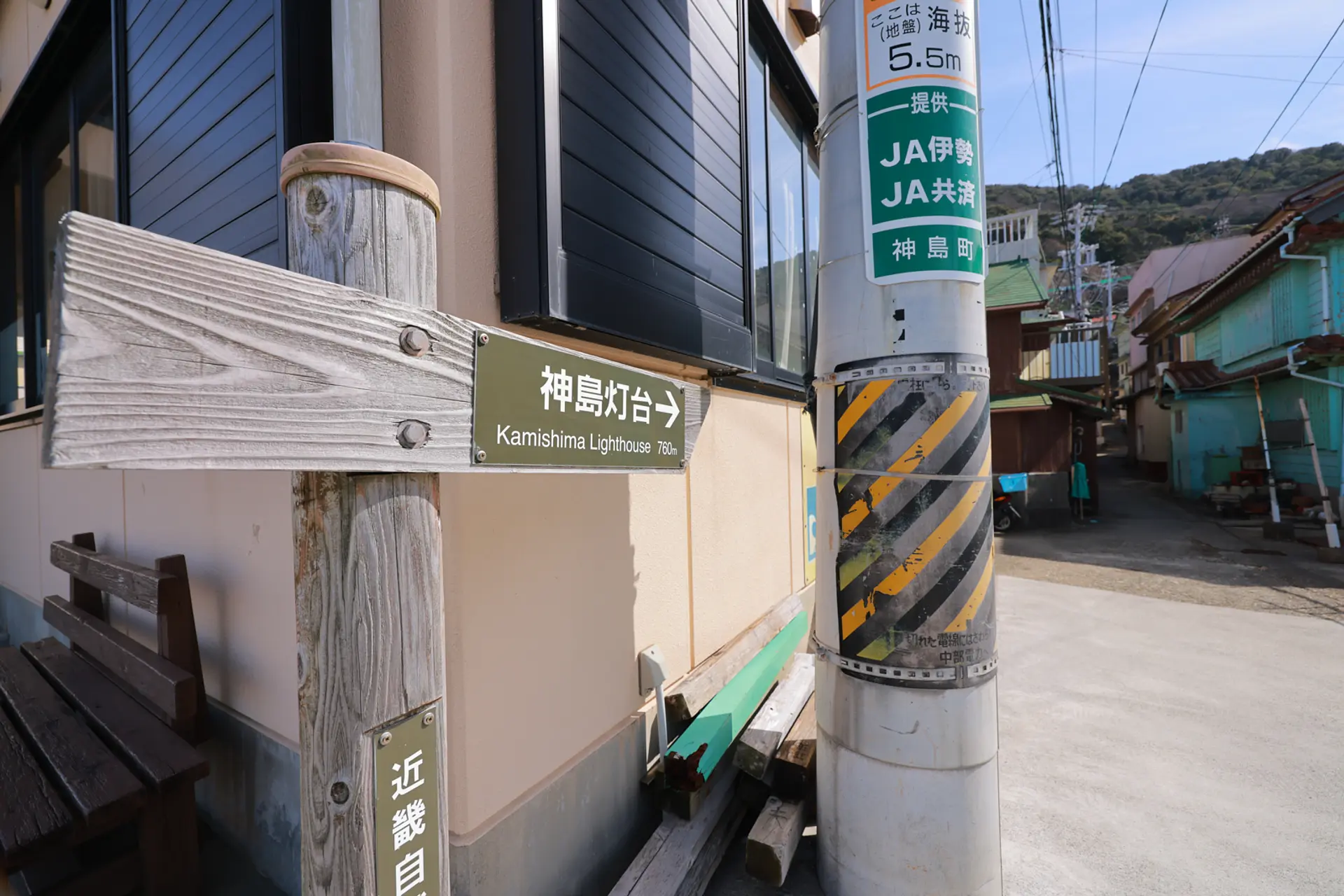 まずは高台にある八代神社を目指して、集落の路地に入ります。その際、「神島灯台」の案内看板が指す方向に進みましょう。