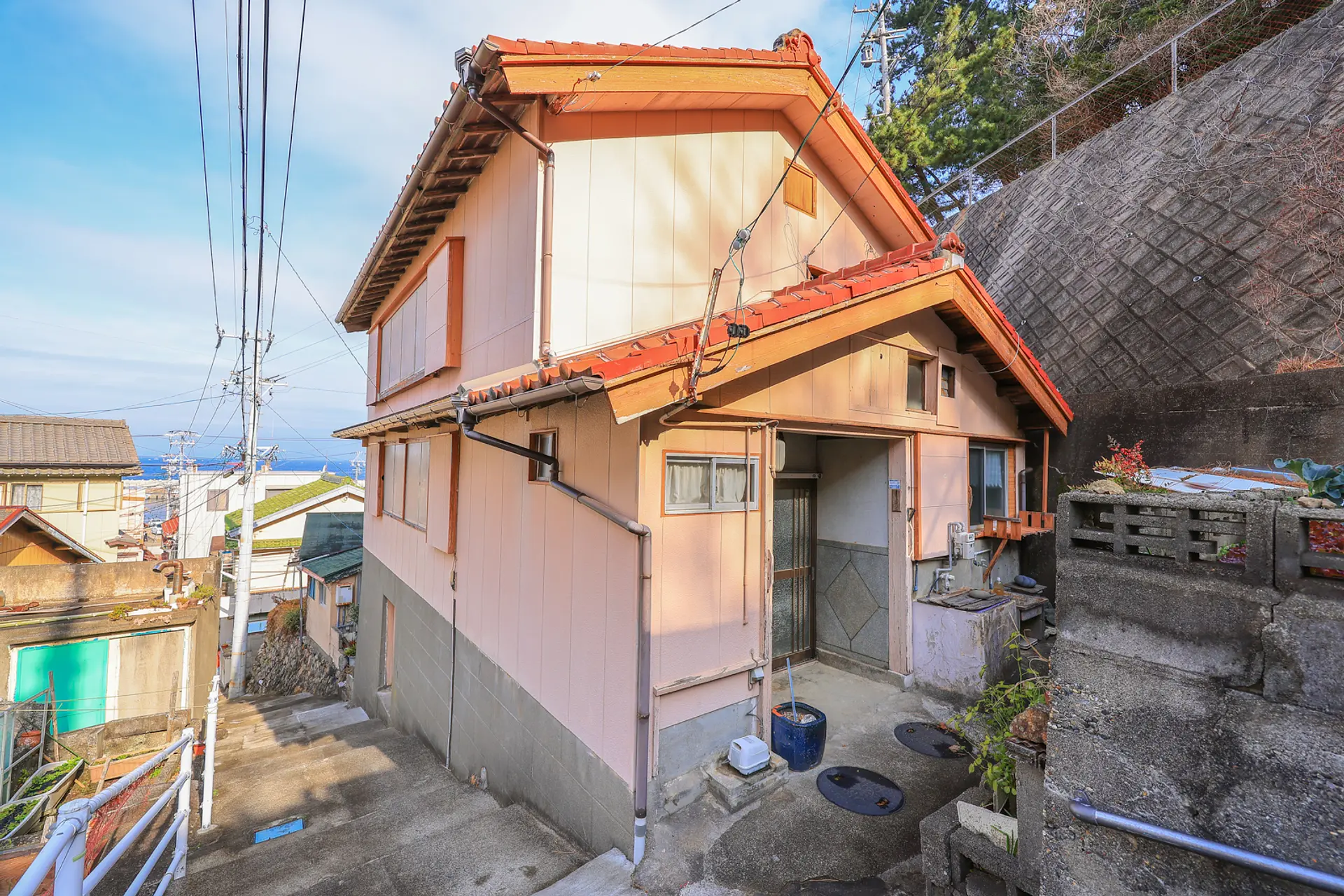 山海荘は、島内でも大きく目立つ4階建ての建物で、玄関口は路地の階段を少し登った先にあります。