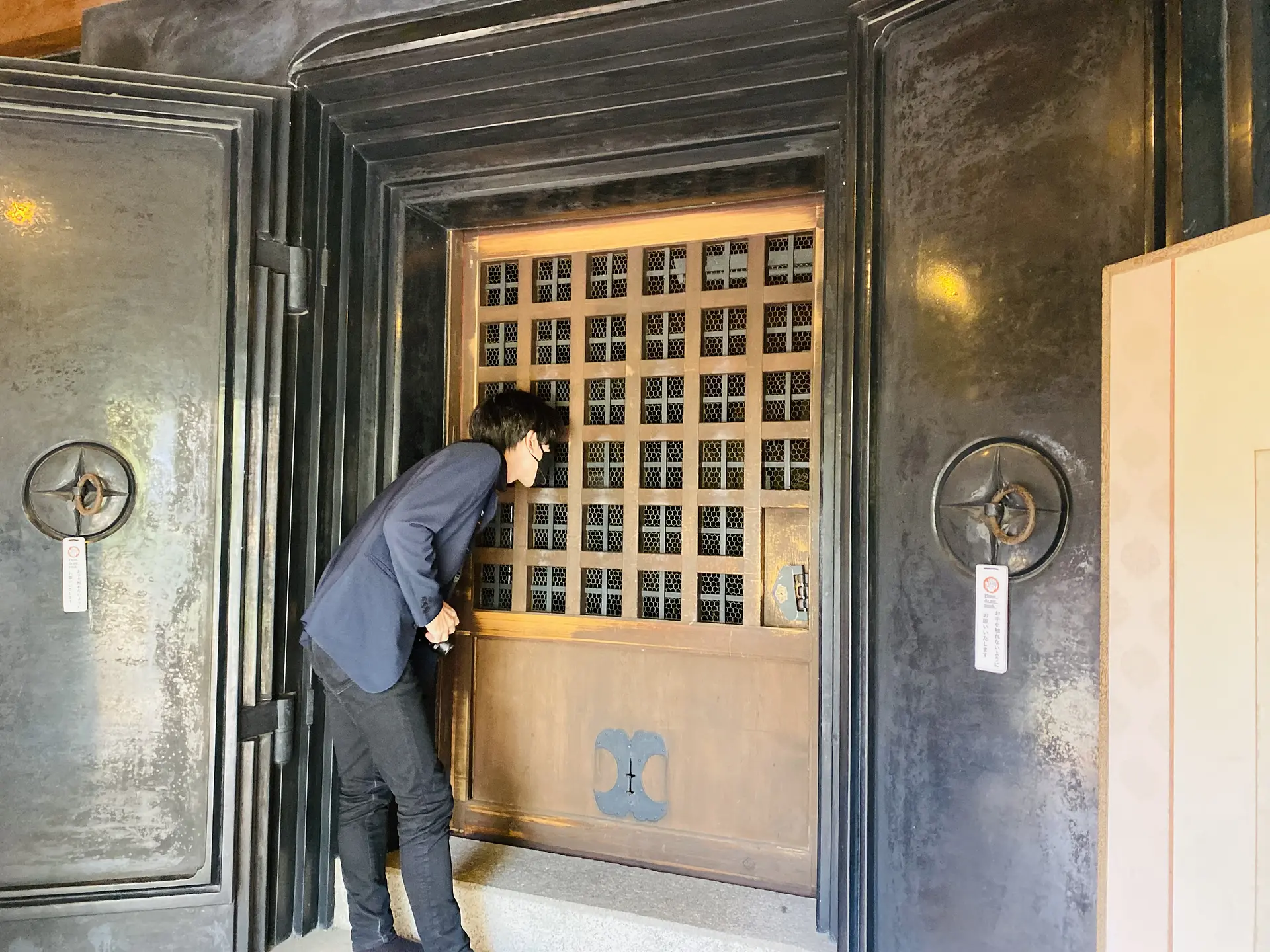 内陣の黄金の扉は、撮影時閉めていたそうです。また、昼間は参拝客がいるため、夜中を通して朝方まで撮影されました。