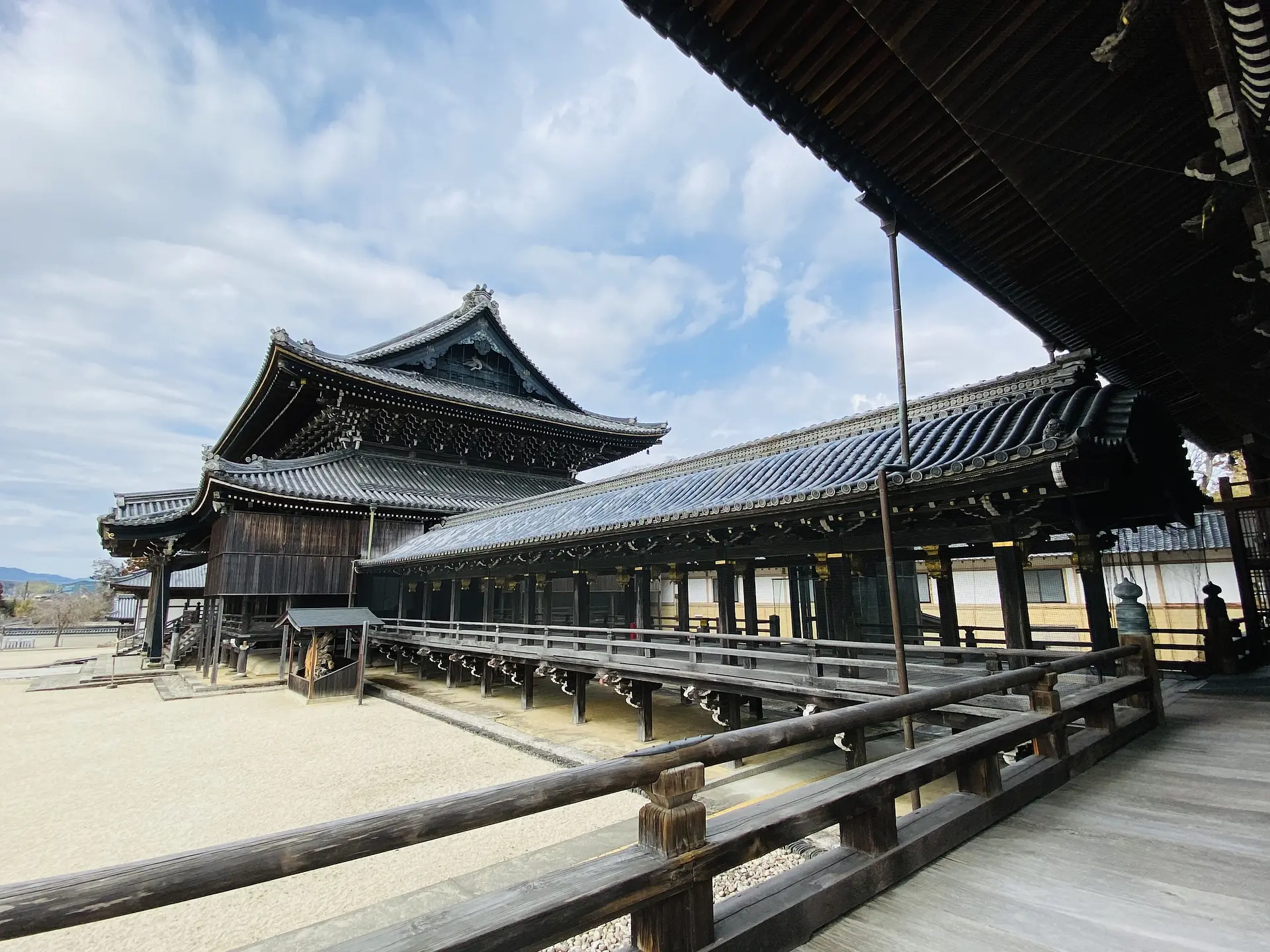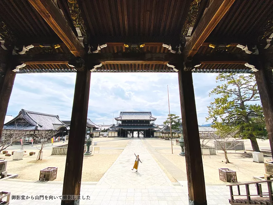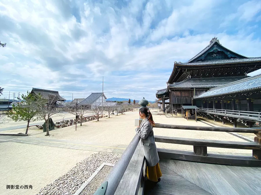 御影堂西角からは、春だと右手側に桜を望むことができます。