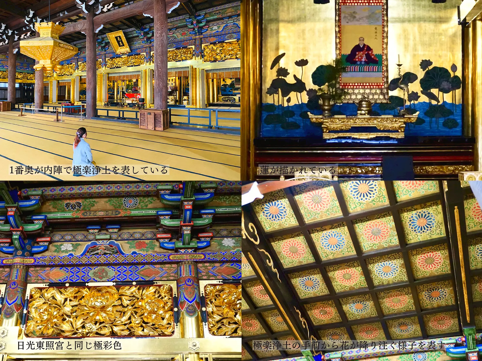 写真左上の私が座っている場所(参拝する場所)を外陣、結界を越えたその前にある段が上がった場所を中陣、さらにその奥の煌びやかな場所を内陣と呼び、内陣は極楽浄土を表現しているそうです。そのため、内陣には極楽浄土で咲くとされている蓮が描かれていました。